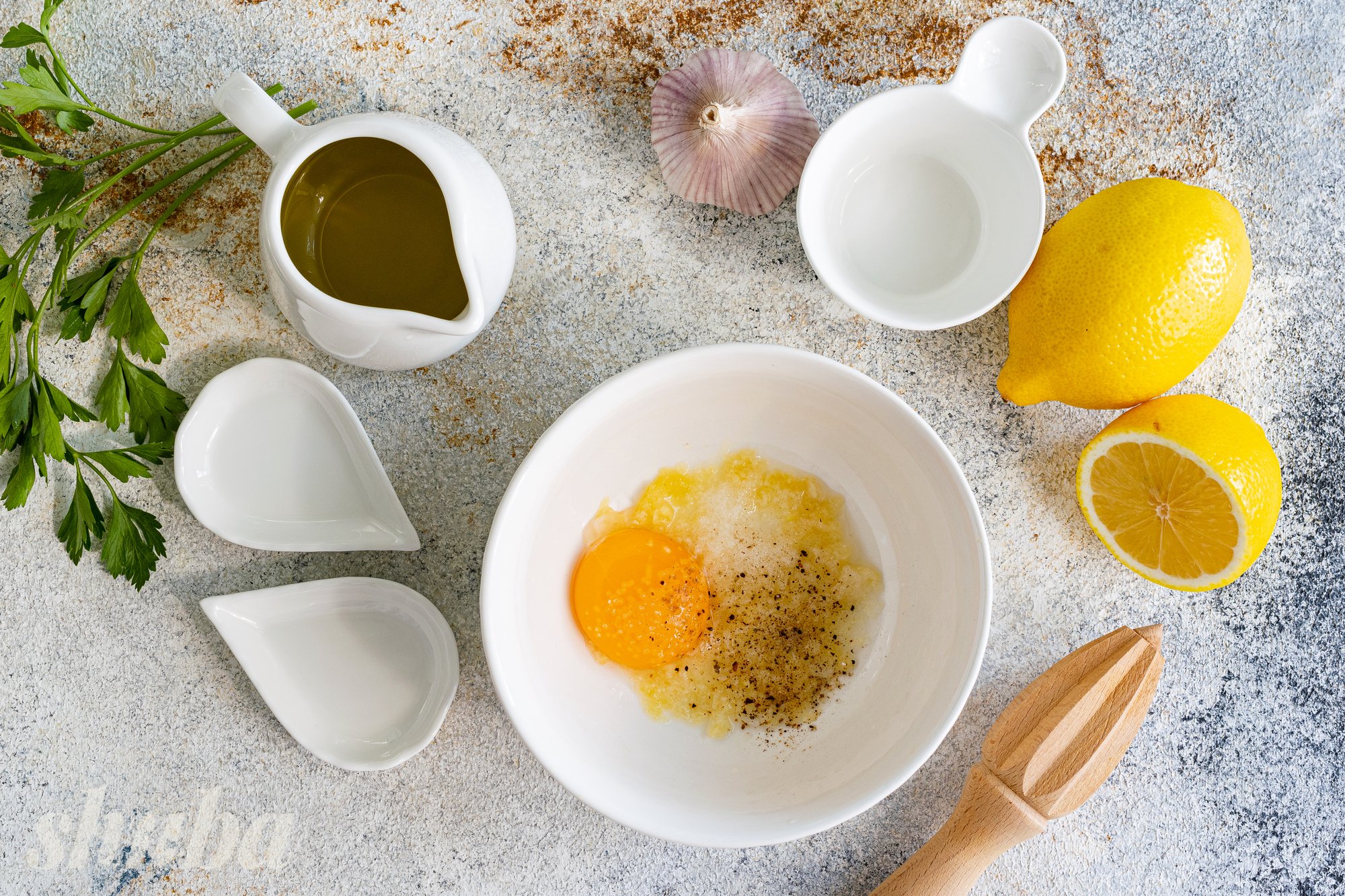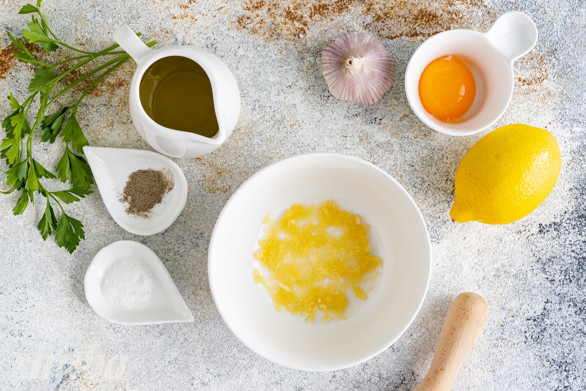 Влий до часнику 1 столову ложку лимонного соку, додай жовток. Посоли інгредієнти за смаком, приправ чорним меленим перцем.