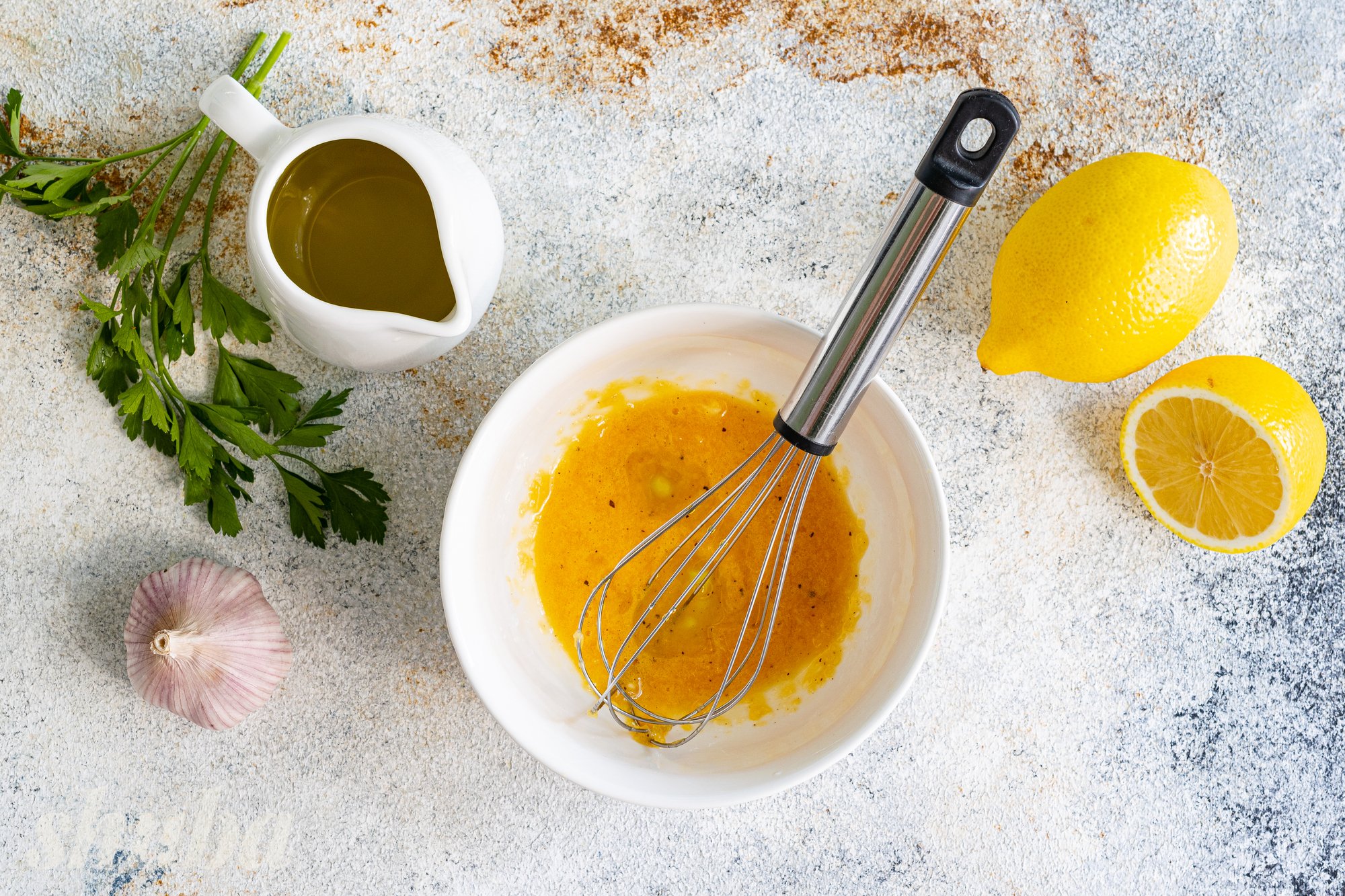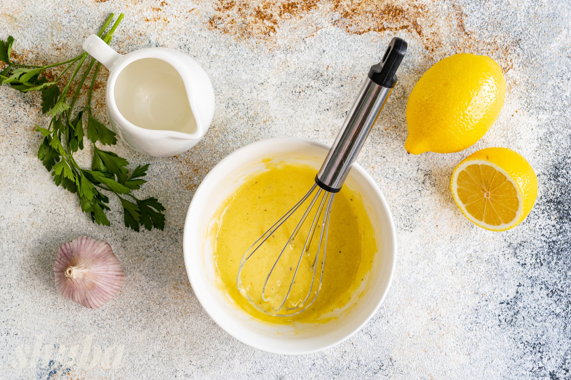 Перемішай інгредієнти вінчиком до однорідної консистенції. Постійно помішуй та маленькими порціями вливай у соус оливкову олію, щоразу перемішуй інгредієнти до однорідної консистенції.