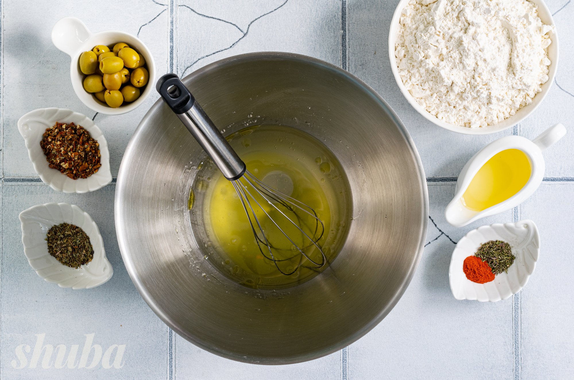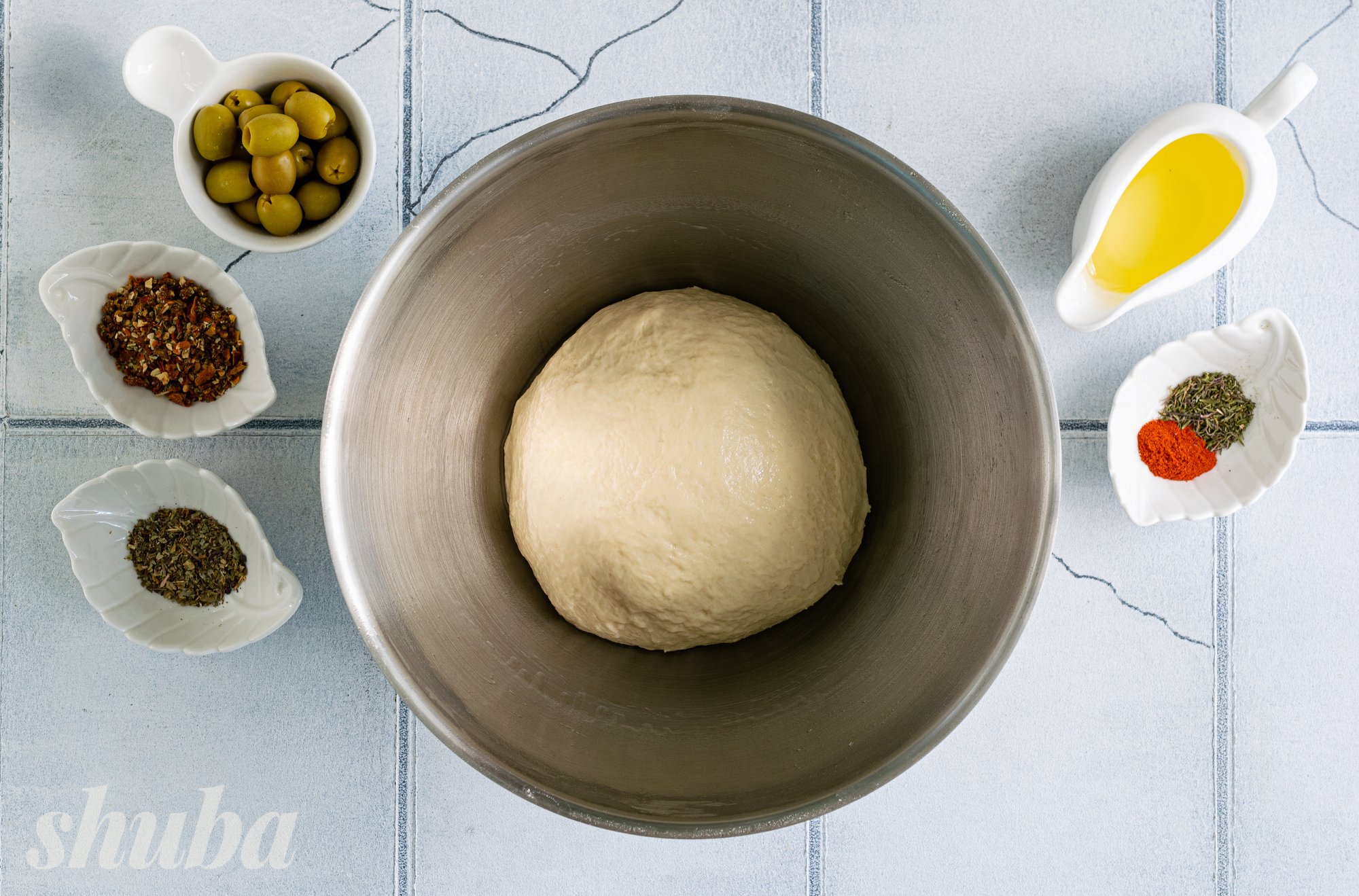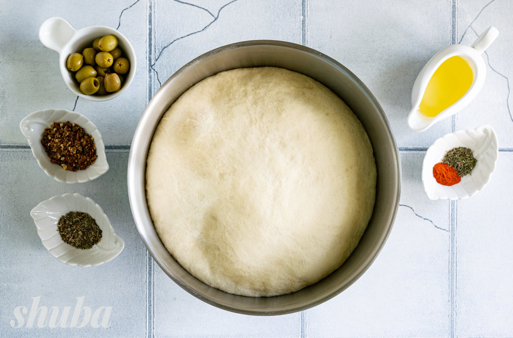 У нашому рецепті фокача набуває середземноморських ноток завдяки оливкам, солодкуватим сушеним томатам, свіжому базиліку та пряному чебрецю. Ці інгредієнти не лише надають хлібу насичений смак, а й наповнюють його ароматами сонячного півдня. Уявіть: щойно випечений коржик, оливкова олія ще злегка переливається на золотистій скоринці, а з духовки доноситься суміш трав’яних і томатних акцентів — утриматися неможливо!