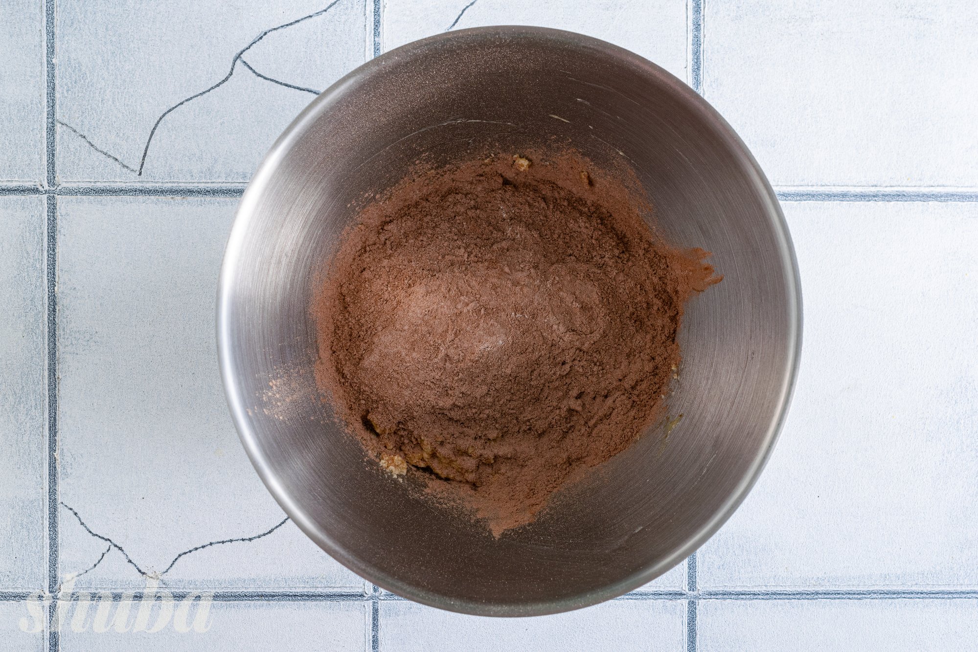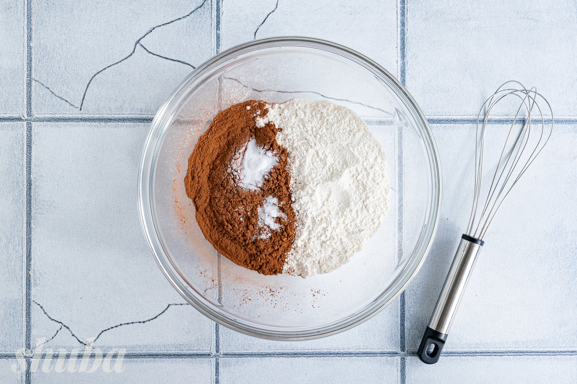В окремому посуді змішай просіяне пшеничне борошно і какао. Додай харчову соду, сіль та ванілін для аромату. Перемішай інгредієнти вінчиком до однорідної консистенції.