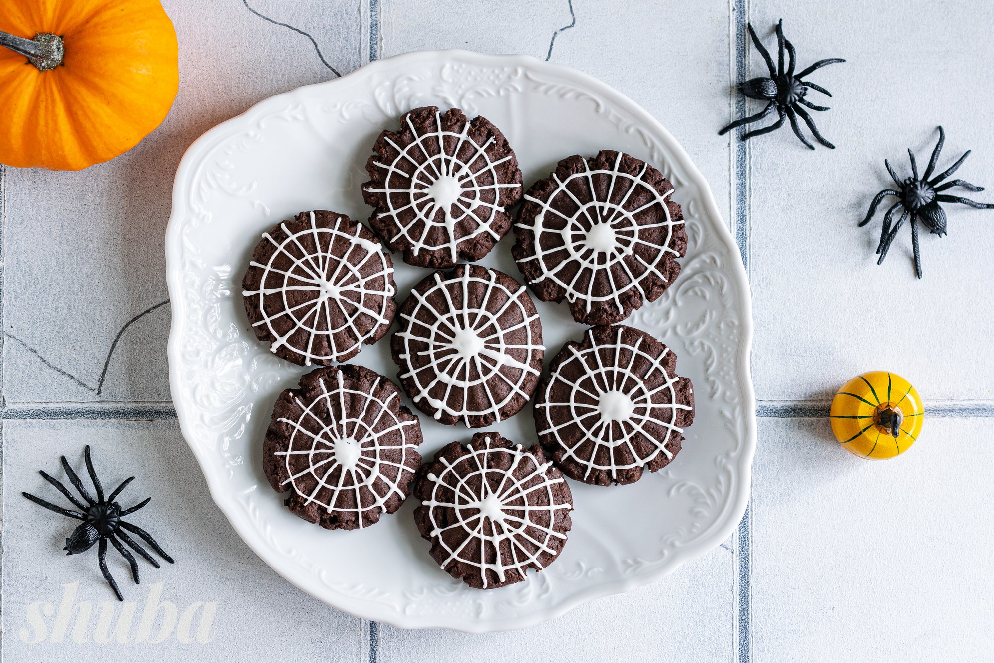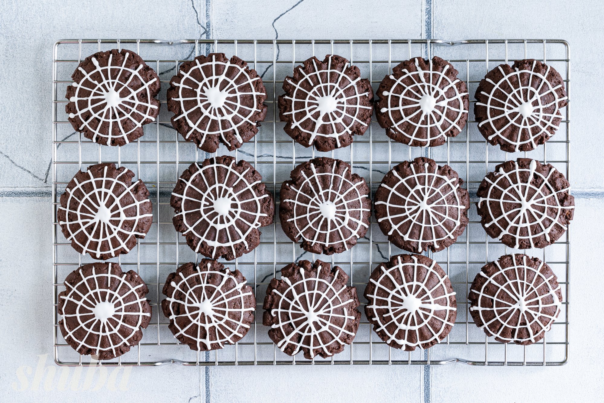 Це шоколадне печиво — справжня окраса гелловінського столу. Темне, насичене, з ніжним ароматом какао й вершкового масла, воно виглядає так само ефектно, як і смакує. Поверхня кожного печива прикрашена білим візерунком у вигляді павутиння. Такий простий, але дивовижний декор створює атмосферу свята з легкою ноткою містики.