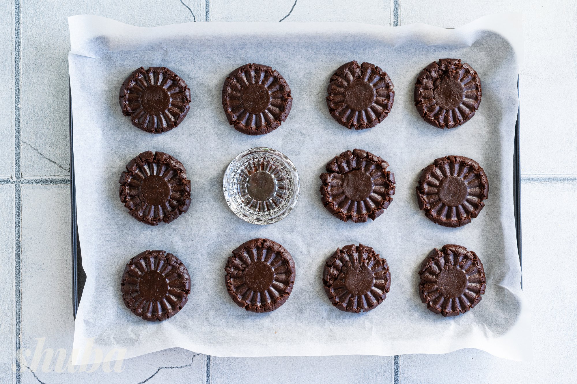Готове охолоджене тісто розділи на шматочки вагою 30 г. З кожного шматочка тіста сформуй кульку. Виклади заготовки на деко, застелене пергаментом, на великій відстані одна від одної. За допомогою склянки приплюсни кожну кульку, формуючи печиво товщиною 7-8 мм. Я використовувала солянку з фігурним денцем у вигляді павутиння.