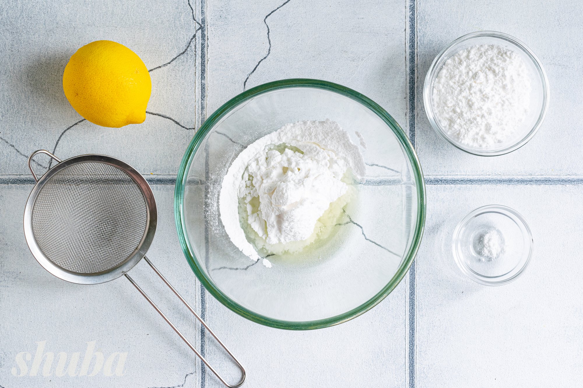 У глибокому посуді з’єднай курячий білок, просіяну цукрову пудру та ванілін. Додай кілька крапель лимонного соку. Збий інгредієнти на максимальній швидкості міксера до отримання густої білої глазурі.