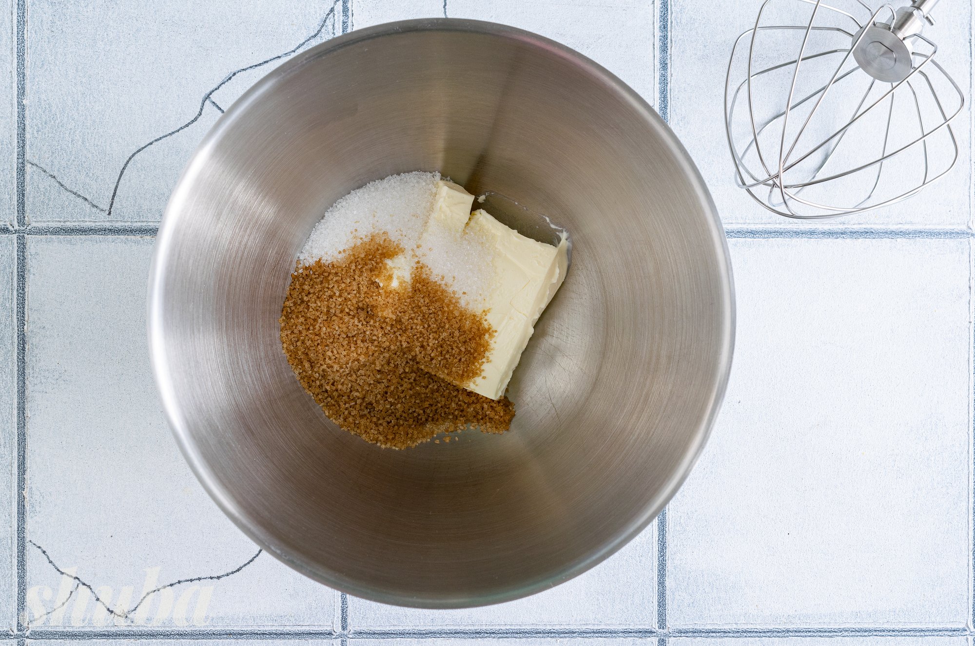 У глибокому посуді з’єднай розм’якшене вершкове масло, коричневий і білий цукор. На максимальній швидкості міксера збий інгредієнти протягом 2-3 хвилин до отримання пишної маси.