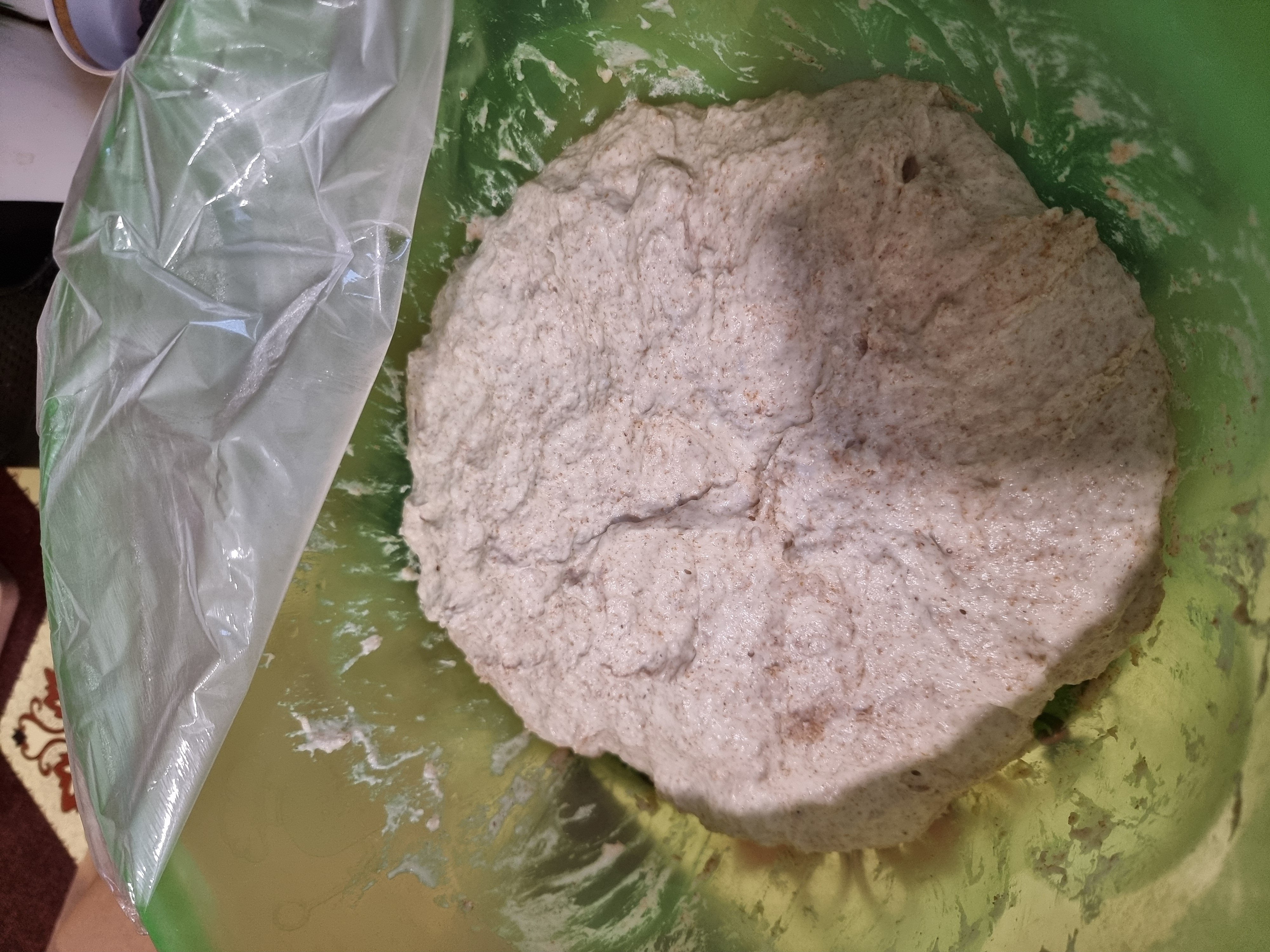 Додати кефір кімнатної температури, сіль, цукор, дріжджі розмішати лопаткою і, якщо консистенція туга, додати трішки води. Якщо ж рідка — трішки цільнозернового борошна.