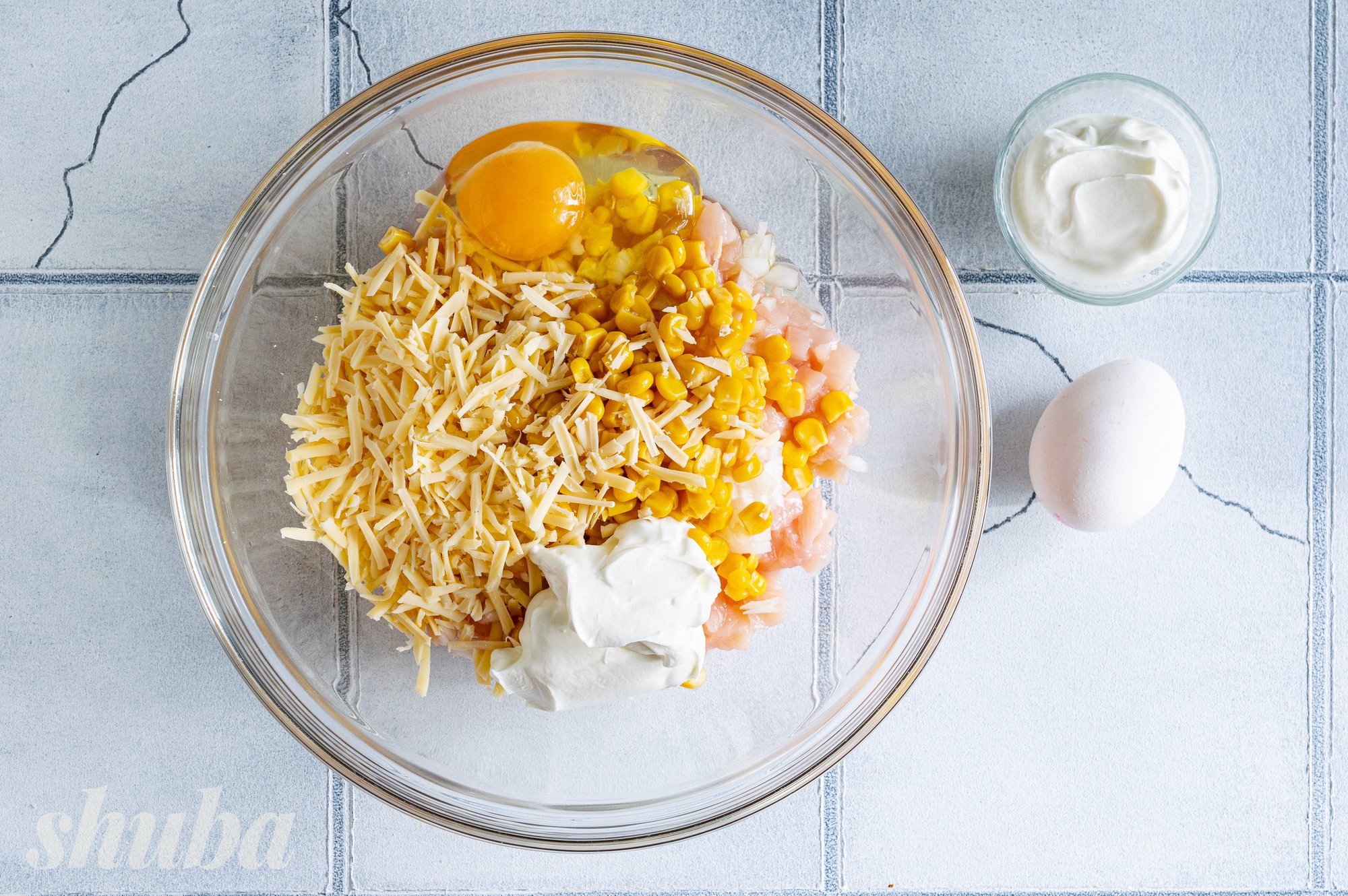В отриману суміш вбий 1 куряче яйце, додай жирну сметану. За бажанням сметану можна замінити густим натуральним йогуртом.