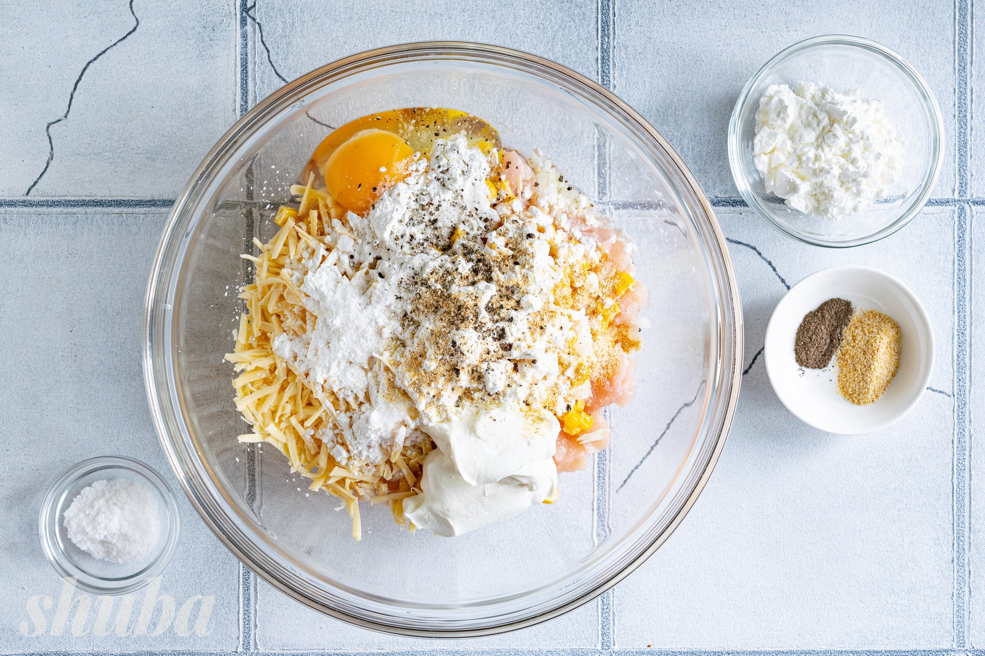 Введи у фарш для січеників рисове борошно, також можна використовувати пшеничне або кукурудзяне борошно. Посоли інгредієнти за смаком, приправ меленими спеціями. Я використовувала сушений часник та чорний перець. За бажанням можна додати готову суміш спецій для курки.