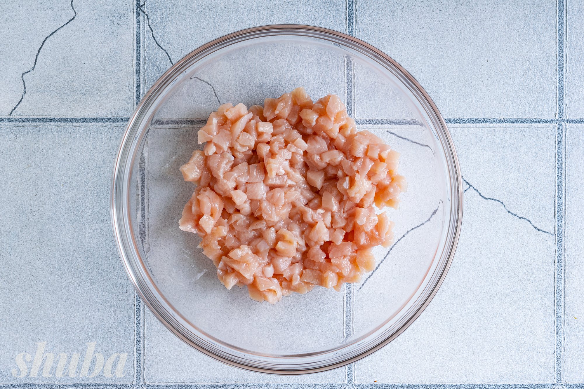 Помий м’ясо під проточною водою, обсуши від зайвої вологи паперовими серветками, зачисти філе від жиру та плівочок, наріж дрібним кубиком і переклади в глибоку тарілку.