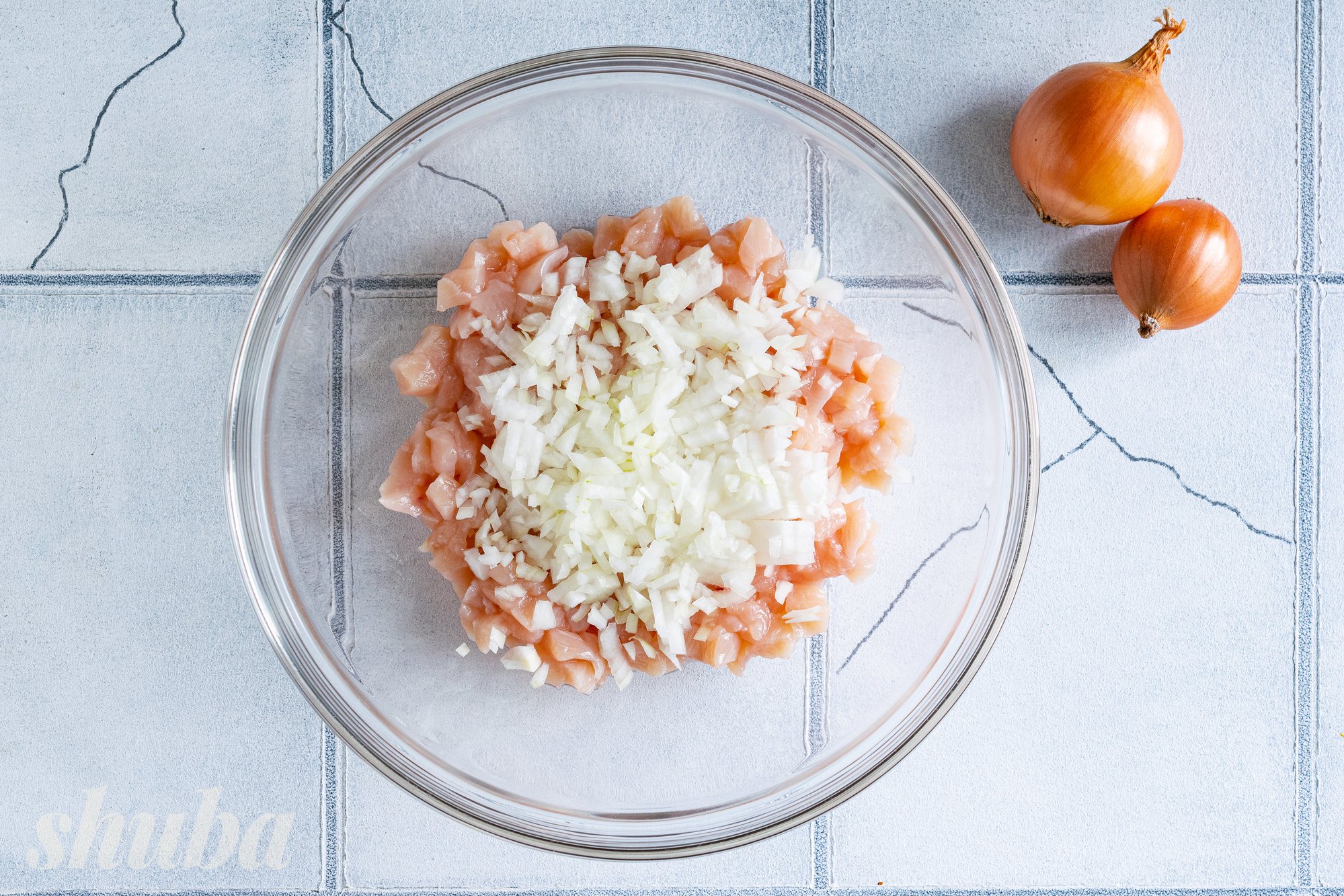 Ріпчасту цибулю очисти від лушпиння, наріж дрібним кубиком, додай до курячого філе.