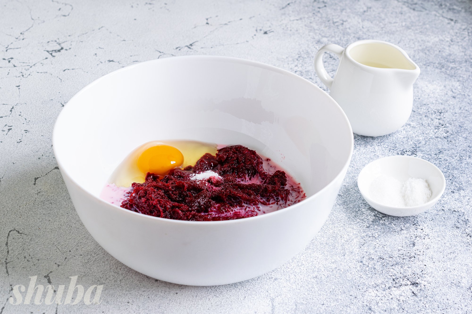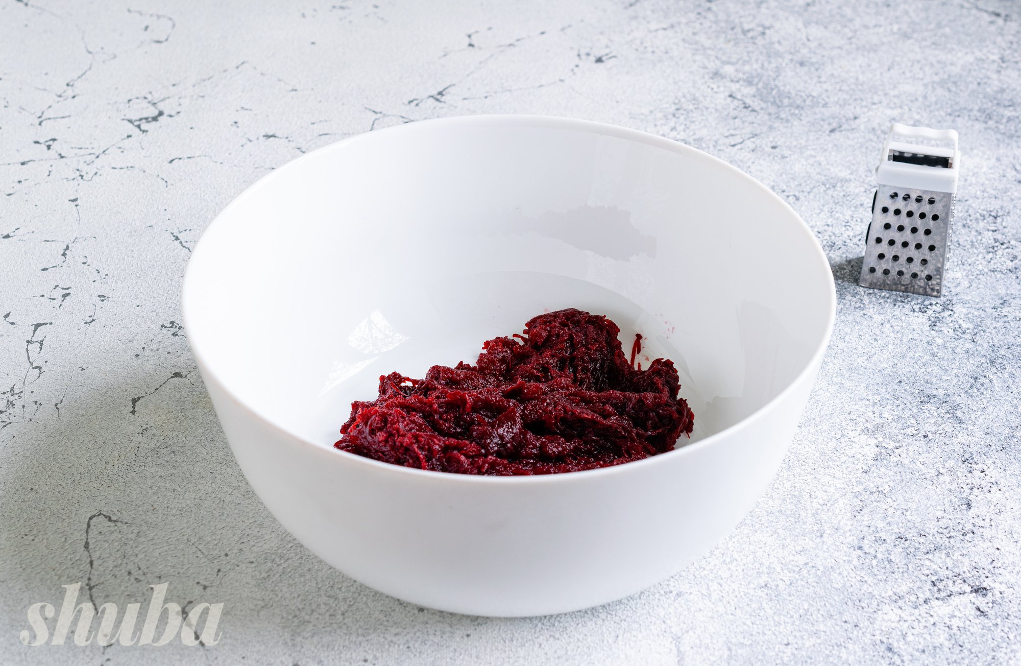 Помий буряк, відвари його до готовності або запечи в духовці. Остуди овочі до кімнатної температури, подрібни на тертці з дрібним полотном, переклади в глибоку піалу.