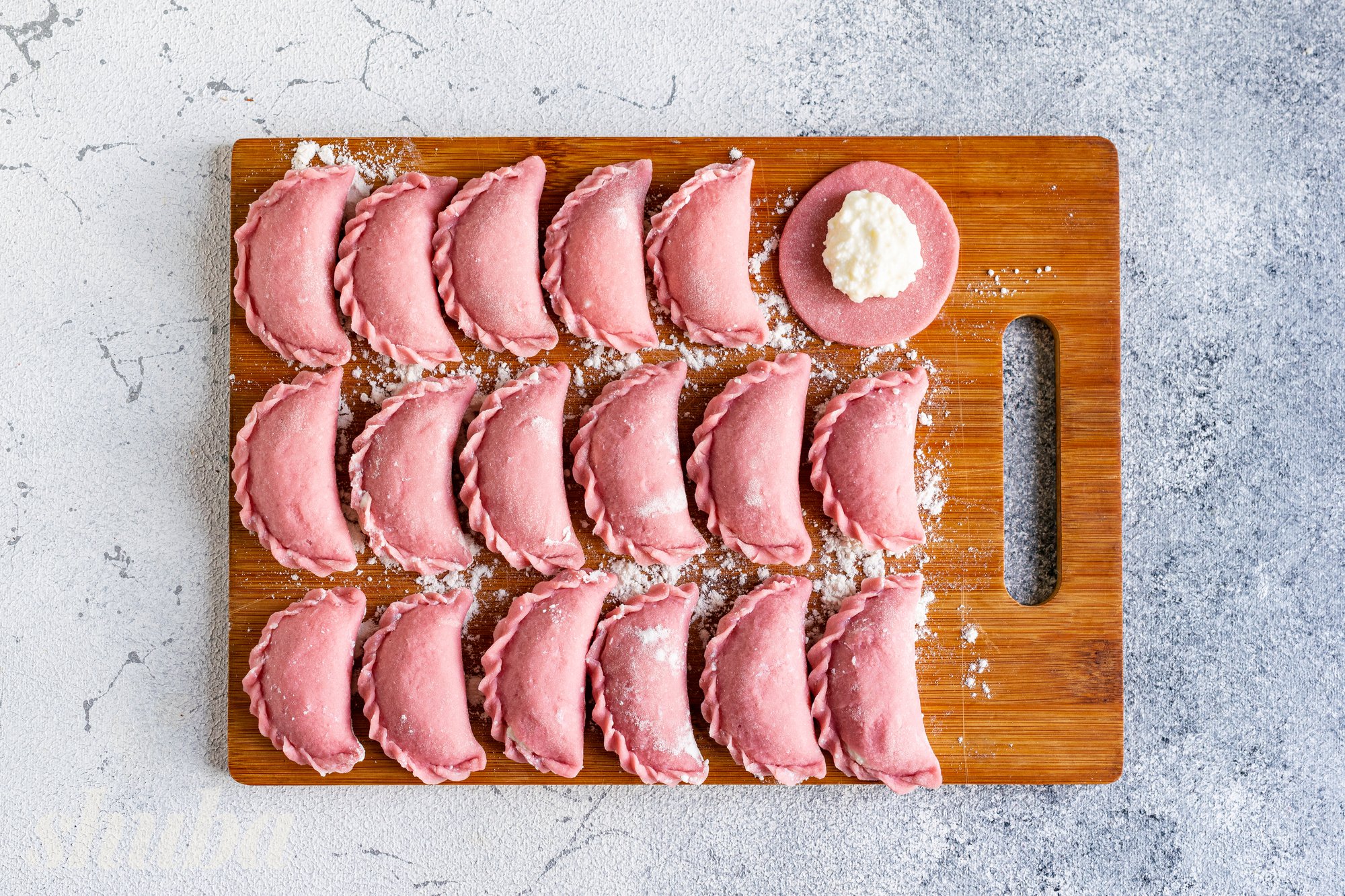У центр кожної заготовки виклади невелику кількість сирної начинки. Ретельно защипни краї тіста, сформуй фігурну косу. Виклади вареники на обробну дошку, посипану пшеничним борошном.