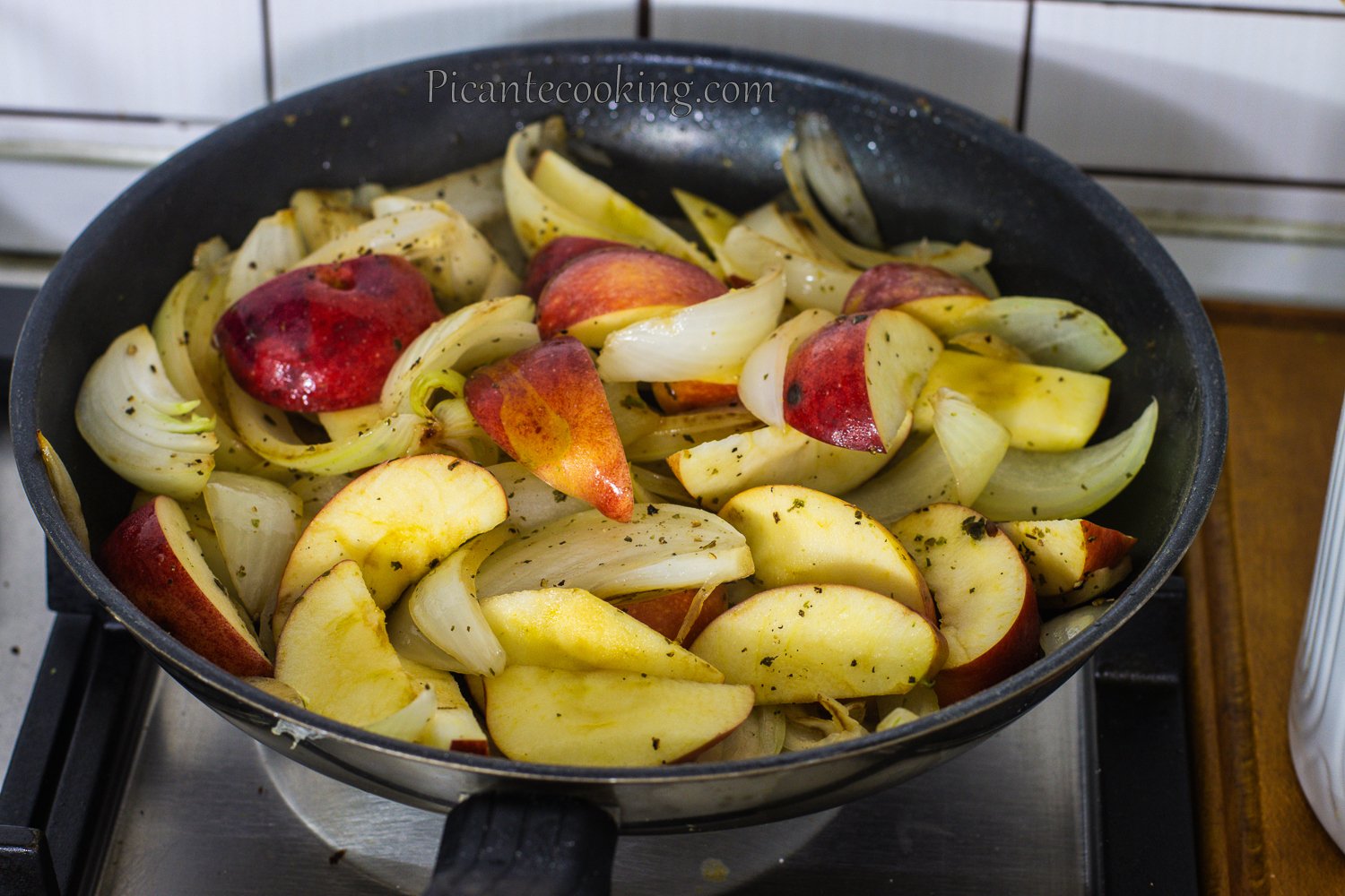 У великій сковорідці розігрій вершкове масло, додай цибулю та ту половину яблук, яку порізала. Посип корицею та майораном.