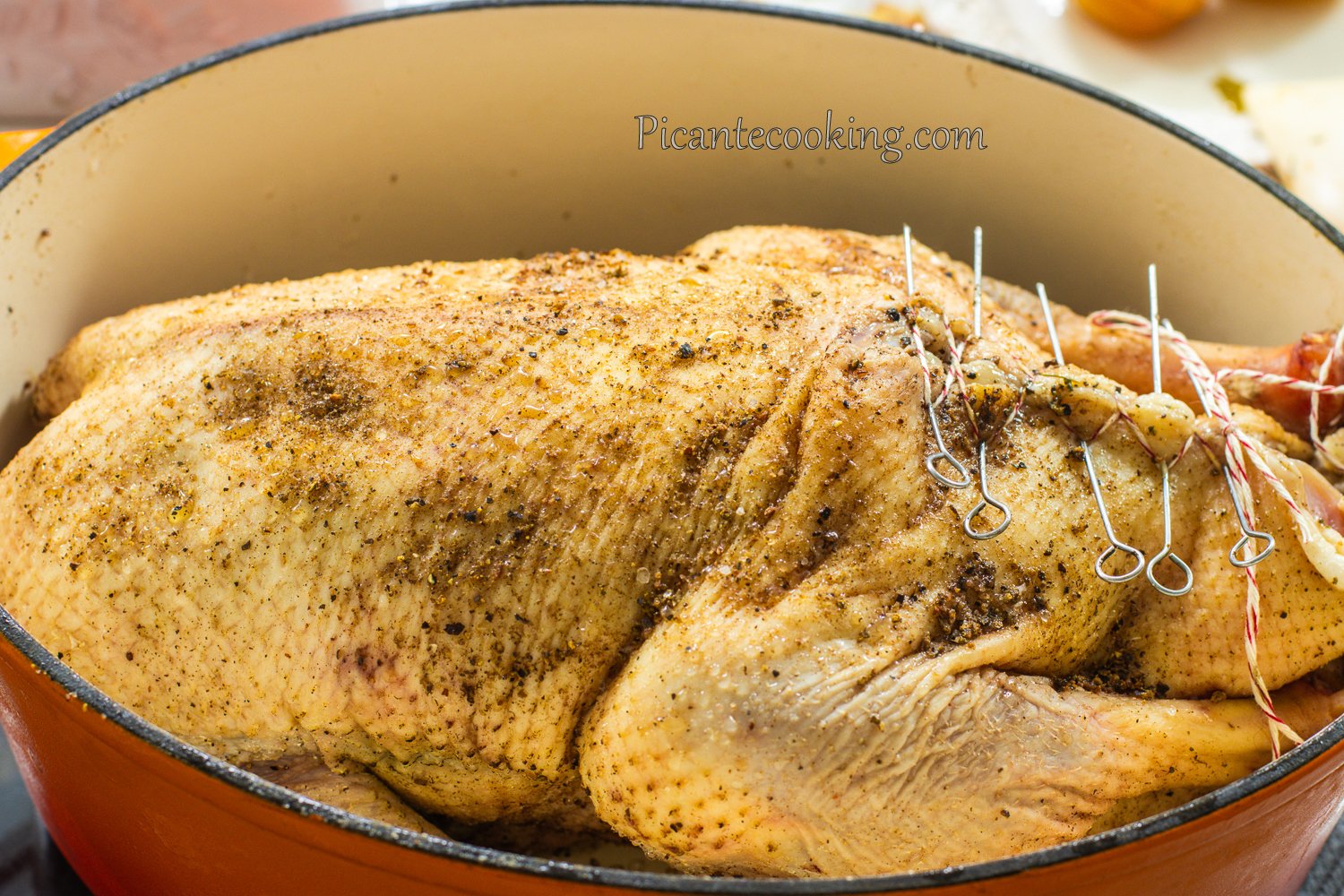 - Дайте начинці повністю охолонути, перед тим як фарширувати птицю. Тепла начинка може передчасно розтопити жир під шкірою, а нам потрібно, щоб він вивільнявся поступово.