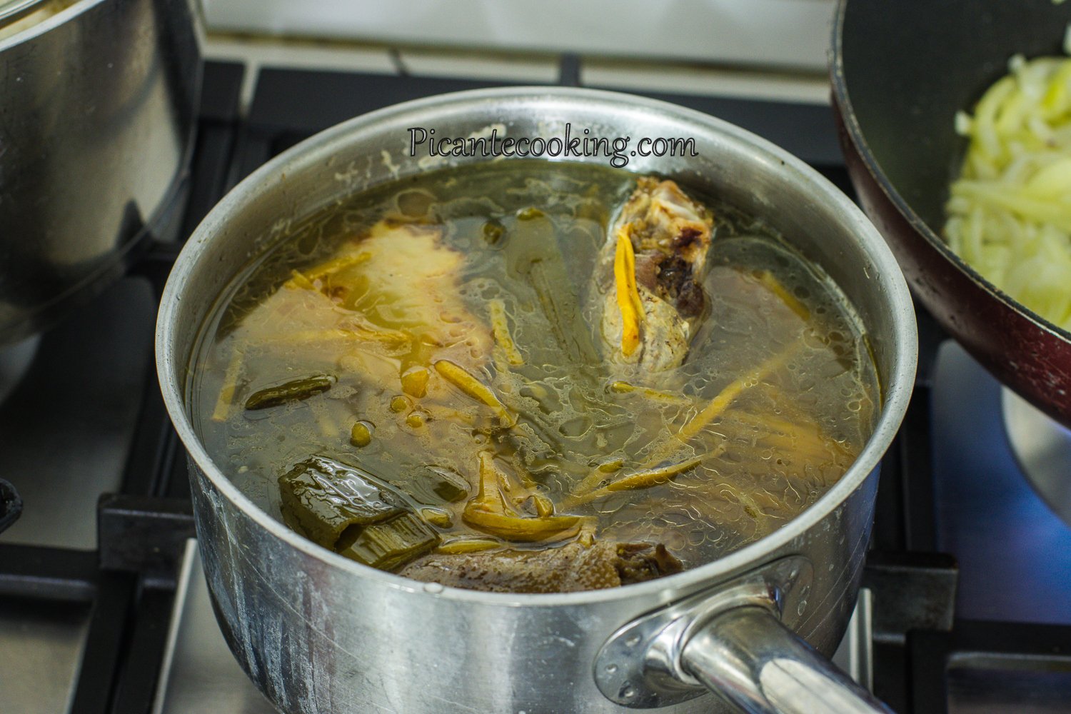 Поки гуска печеться, одразу ж крильця, шию, шлунок та усі овочі помісти у 2 л сотейник.