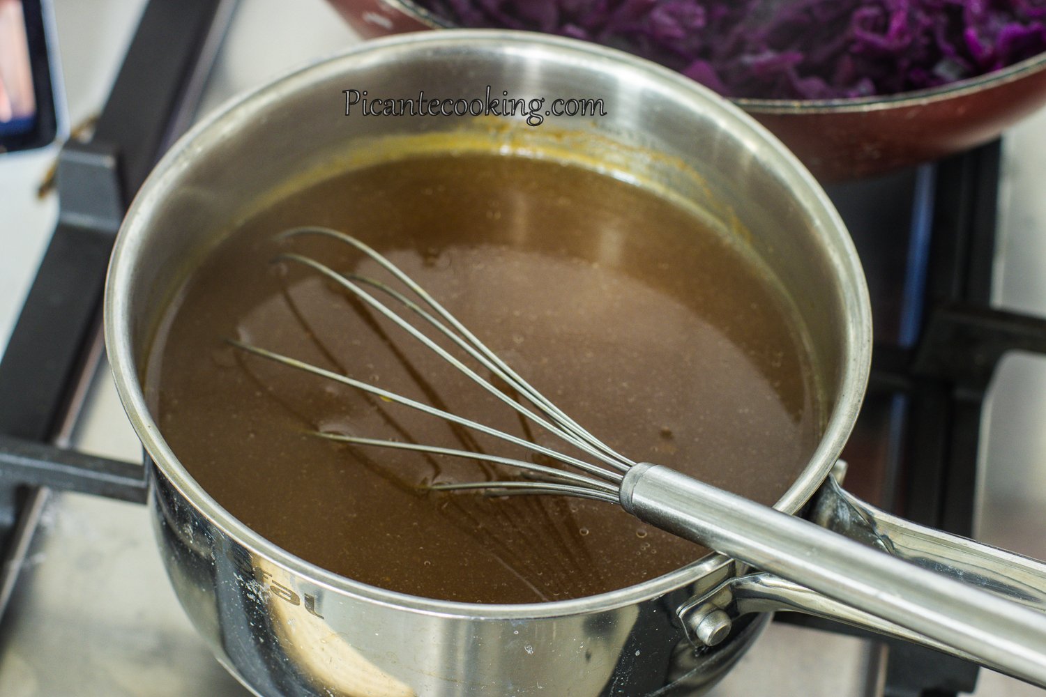 - Соус готується на бульйоні з гусячих обрізків (довгої шиї, кострубатих кінців крилець, які треба зрізати) та м’ясних соках, що накопичилися під час запікання. Увага, їх не вказуємо в інгредієнтах. Важливо ретельно зняти жир з тих м’ясних соків, щоб соус залишився легким, ароматним і шовковистим.