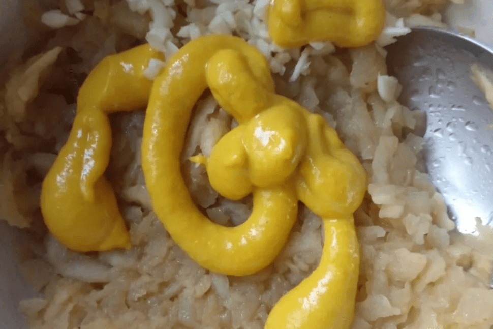 - Для соусу беремо два зелених яблука. Їх потрібно потушкувати до випаровування рідини, а потім поєднати з лагідною гірчицею.