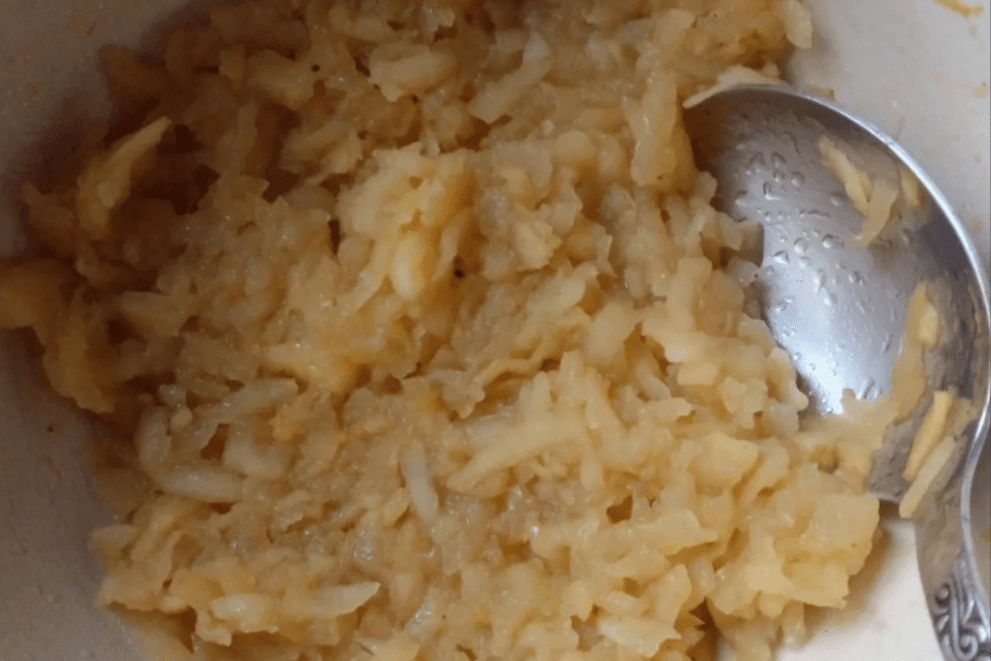 - Бери картоплю середнього розміру. Після натирання залиши її на 10-15 хв, щоб стік сік. Для щільності тіста додаємо крохмаль.