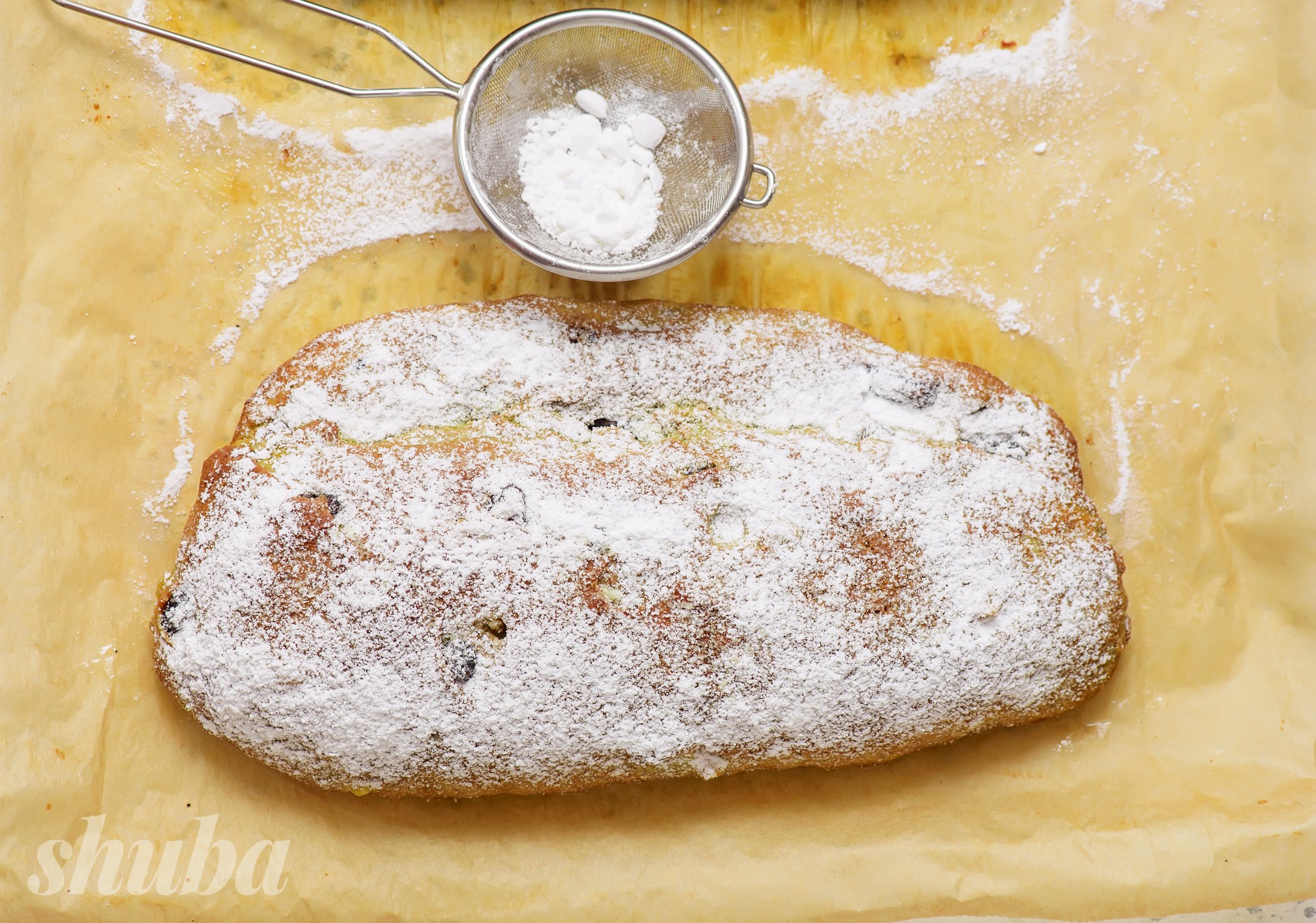 Розігрій духовку до 180 °C та випікай штолен на середньому рівні приблизно 35 хвилин, до золотистої скоринки. Переклади на решітку, одразу змасти рештою масла, дай охолонути 30 хвилин і щедро посип цукровою пудрою.