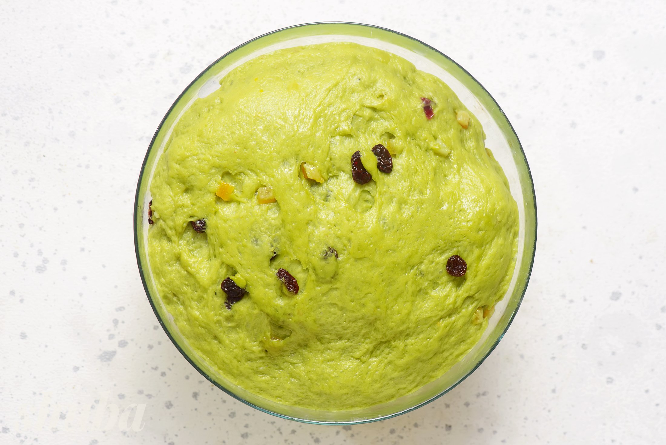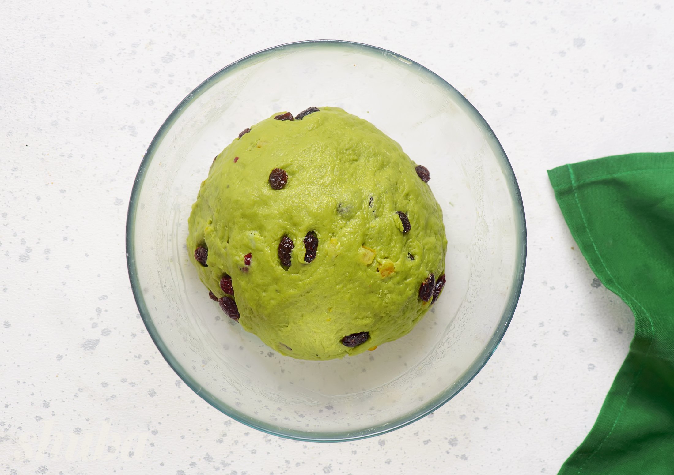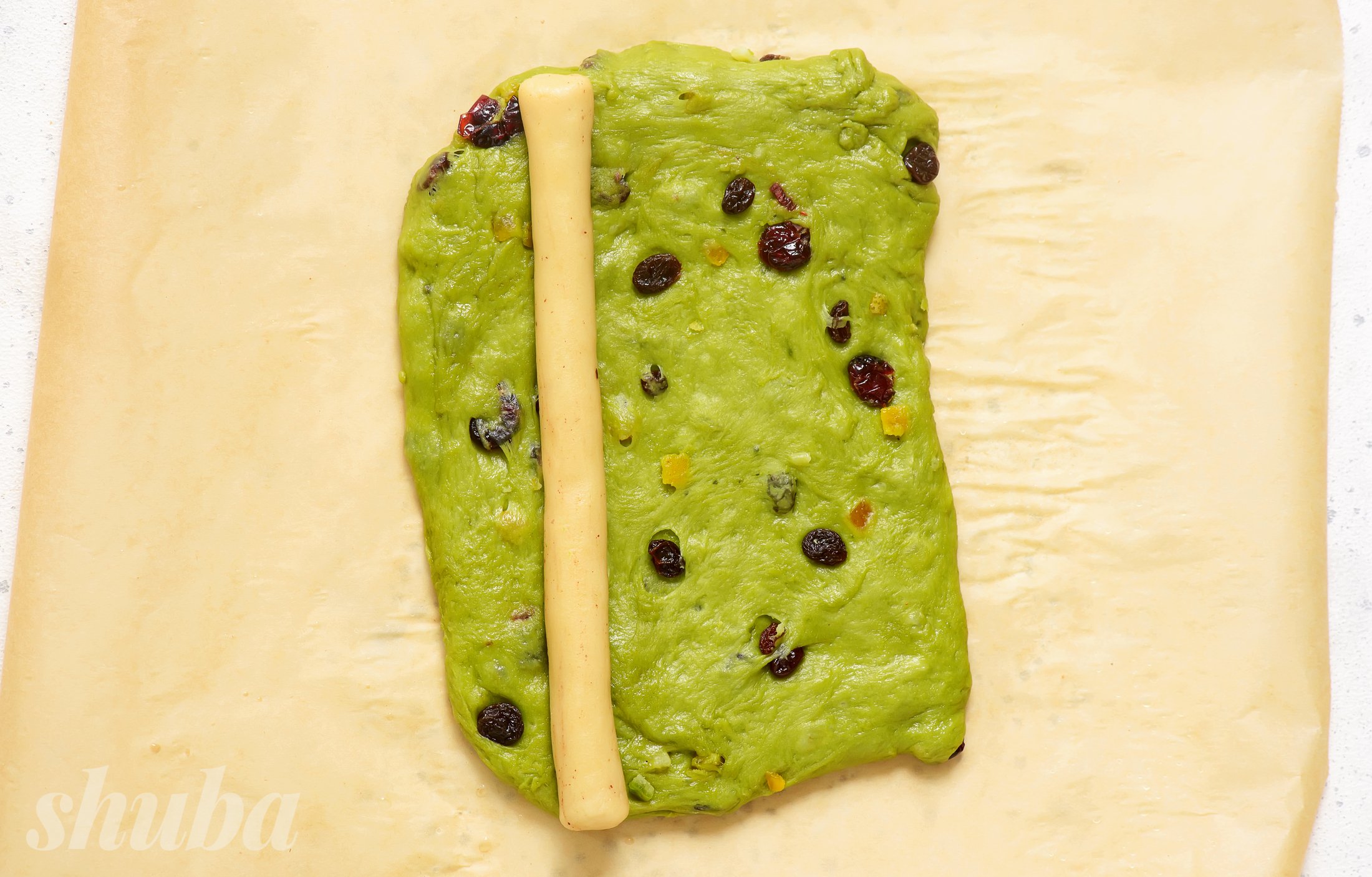 Тісто для штолена готується на сухих дріжджах, борошні та одному яйці. Порошок матча надає йому свіжий смак та зелений колір. А мигдалевий марципан доповнює начинку з сухофруктів — апельсинові цукати, родзинки та вʼялену журавлину. Марципан не змішується з тістом, а викладається окремим валиком — так начинка зберігає форму та смаки після випікання.