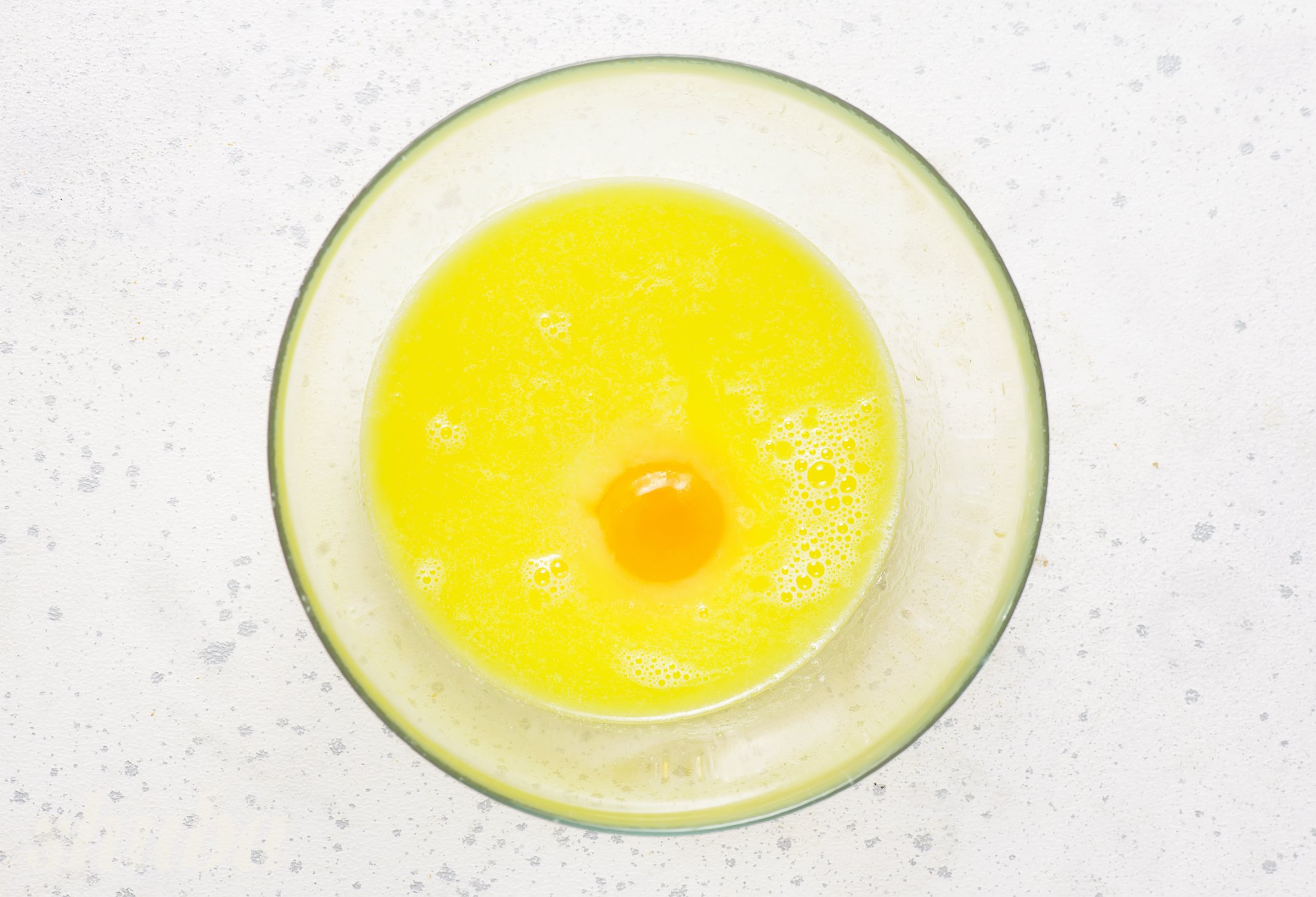 У жаростійкій мисці, поєднай молоко, вершкове масло та цукор. Прогрій суміш у мікрохвильовці приблизно 1 хвилину на максимальній потужності, доки масло повністю не розтане, а цукор не розчиниться. Дай суміші охолонути до теплого стану, додай яйце й добре збий вінчиком до однорідності.