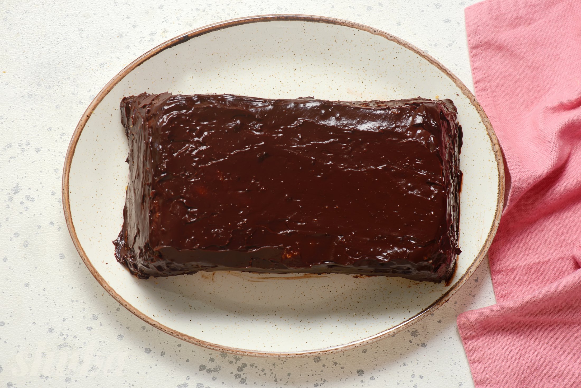 Полий охолоджений сирник гарячою глазур’ю, розрівняй поверхню та боки. Постав у холодильник щонайменше на 4–5 годин або на ніч.