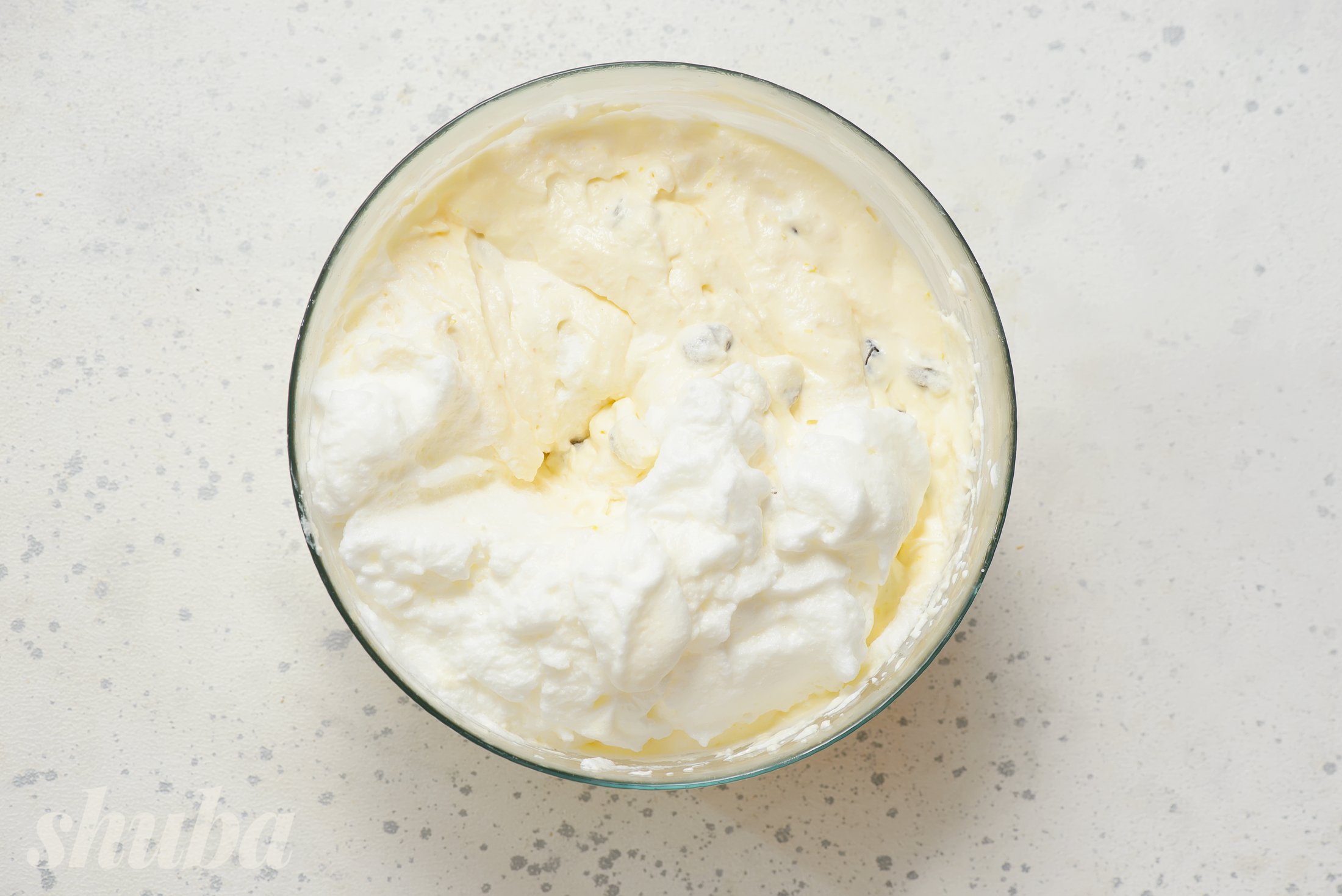 В окремій сухій мисці збий білки до стійких піків. Обережно введи їх у сирну масу, перемішуй лопаткою знизу догори, щоб зберегти повітряність.