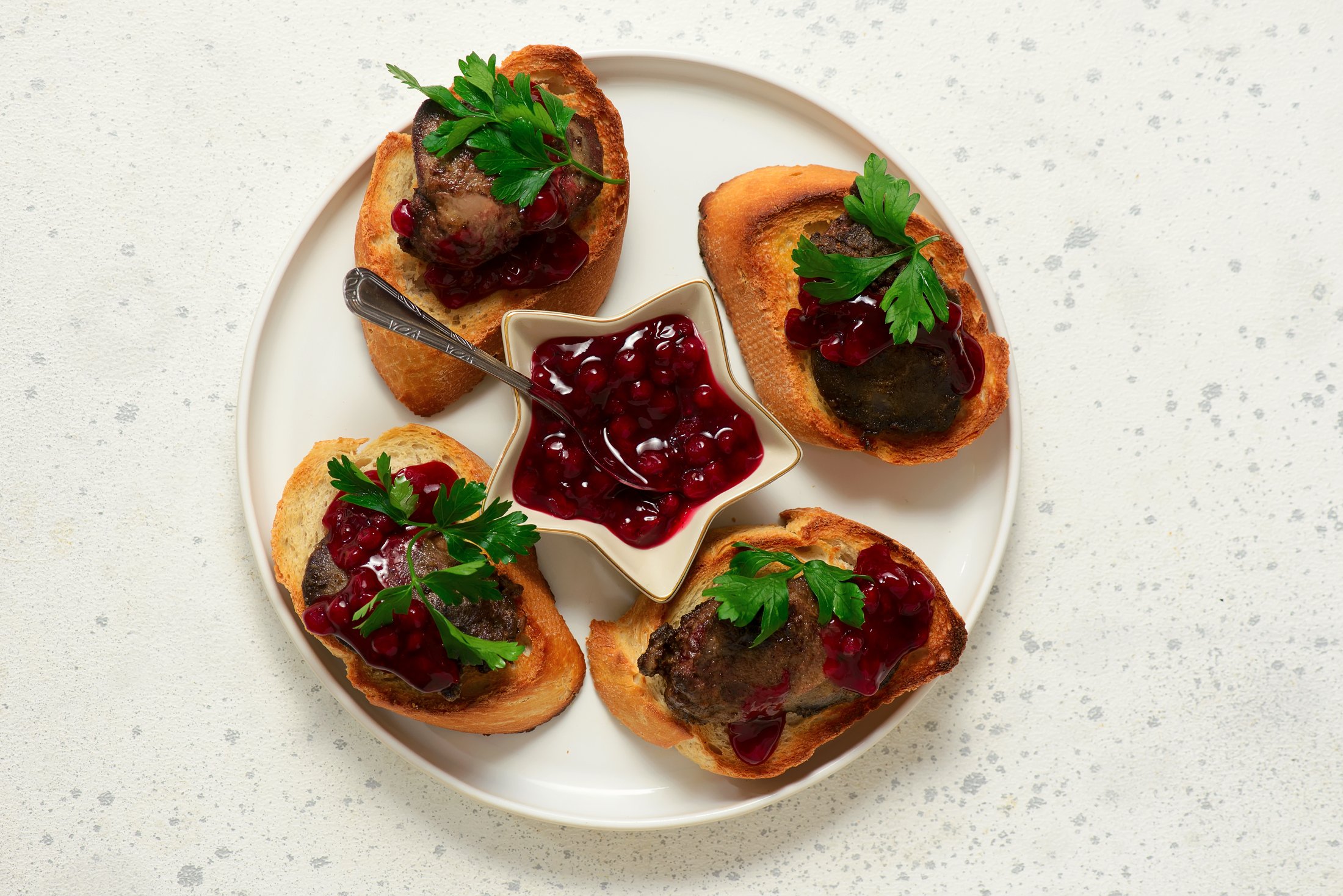 Брускети зі смаженою курячою печінкою та журавлиновим соусом — це смачна закуска з хрумким хлібом, ніжною печінкою та яскравою кисло-солодкою ноткою. Готуються швидко, а на новорічному столі виглядають як справжня прикраса.