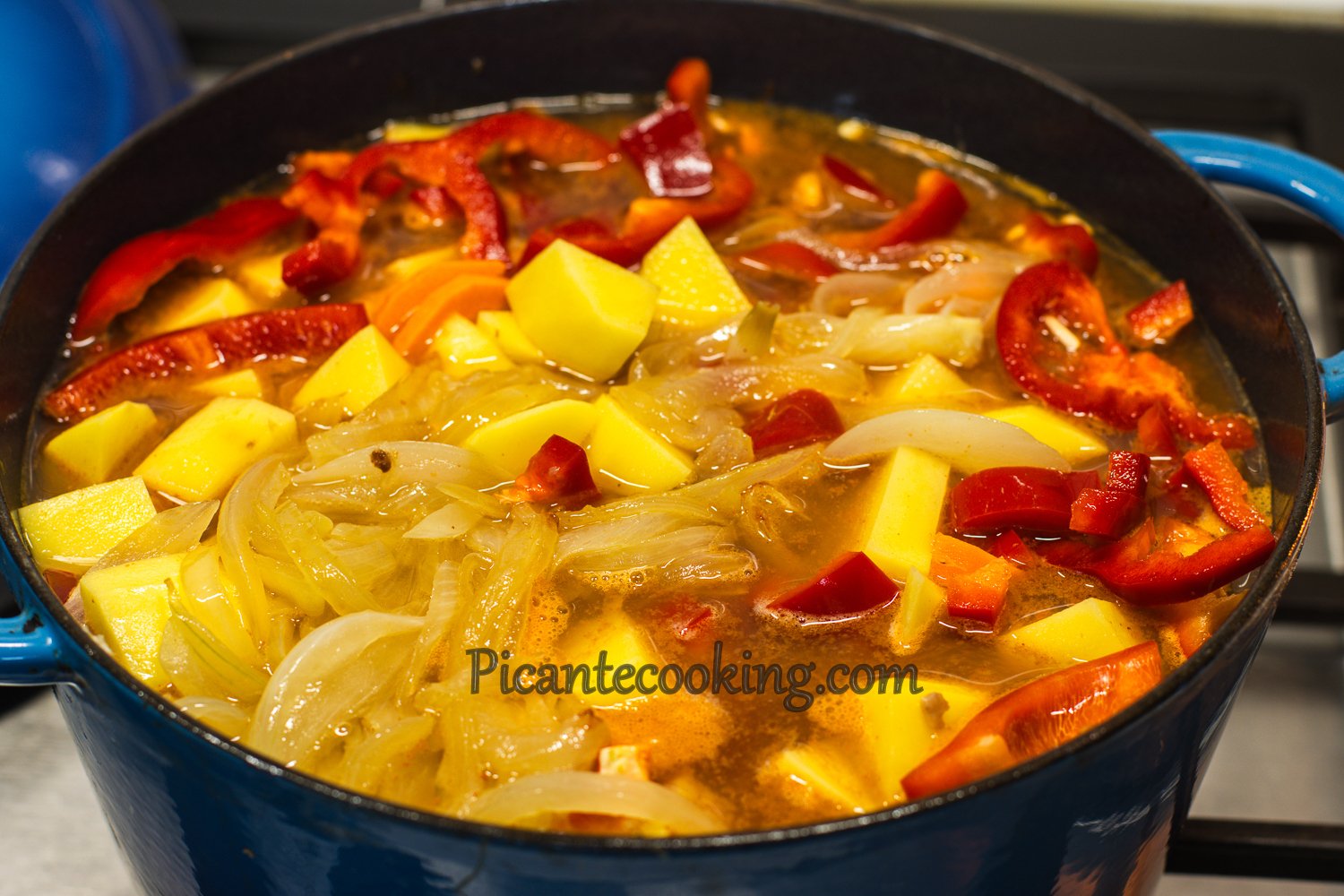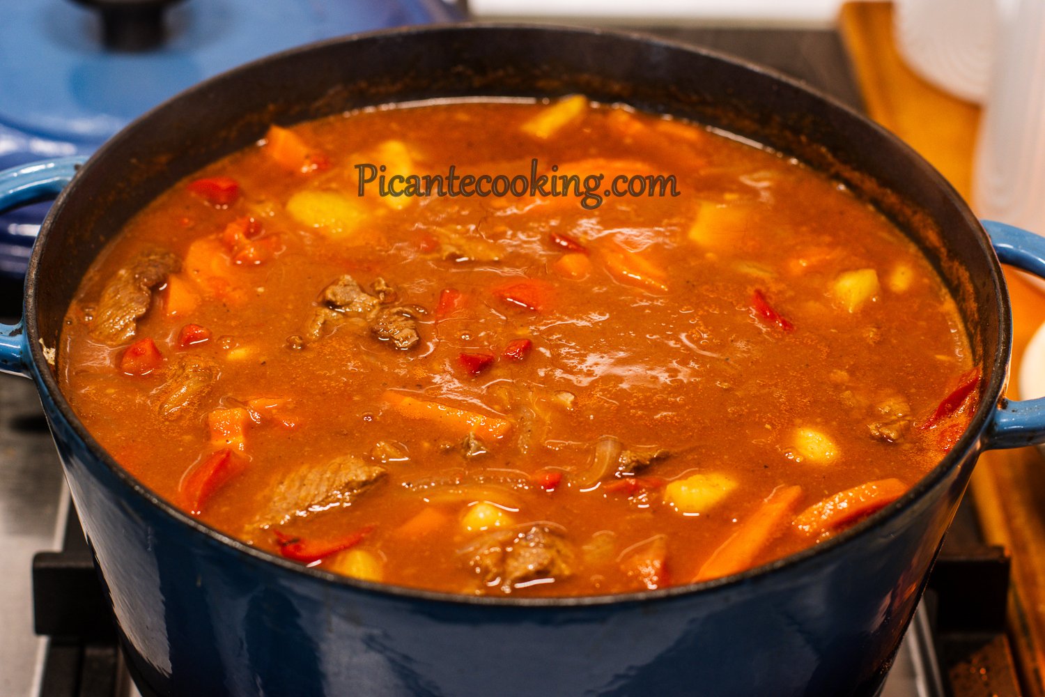 Переклади спеції до гуляшу, вимішай, зменш вогонь так, щоб усе лиш легенько булькало, накрий нещільно кришкою і тушкуй усе приблизно годину, доки овочі зм’якнуть.