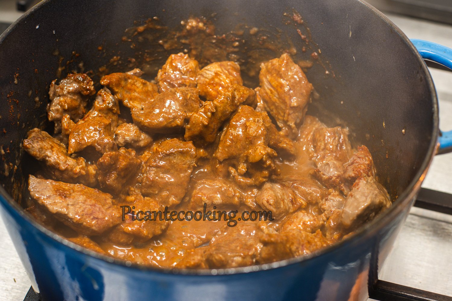 Далі додай цукор і томатну пасту. Вимішай усе разом, доведи до повторного кипіння і вари на маленькому вогні ще 40-60 хвилин, доки м’ясо стане зовсім м’яким, а гуляш гарно загусне.