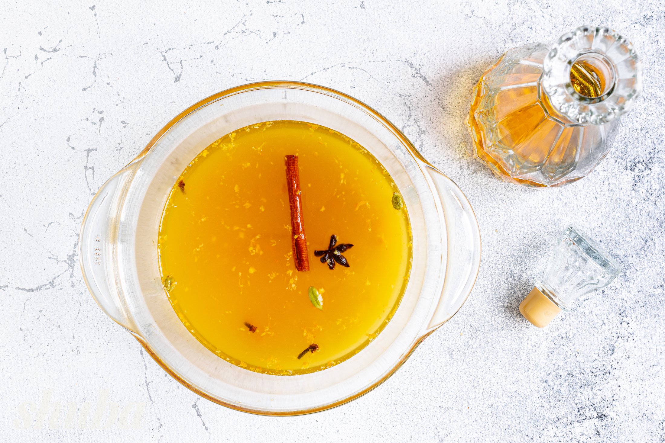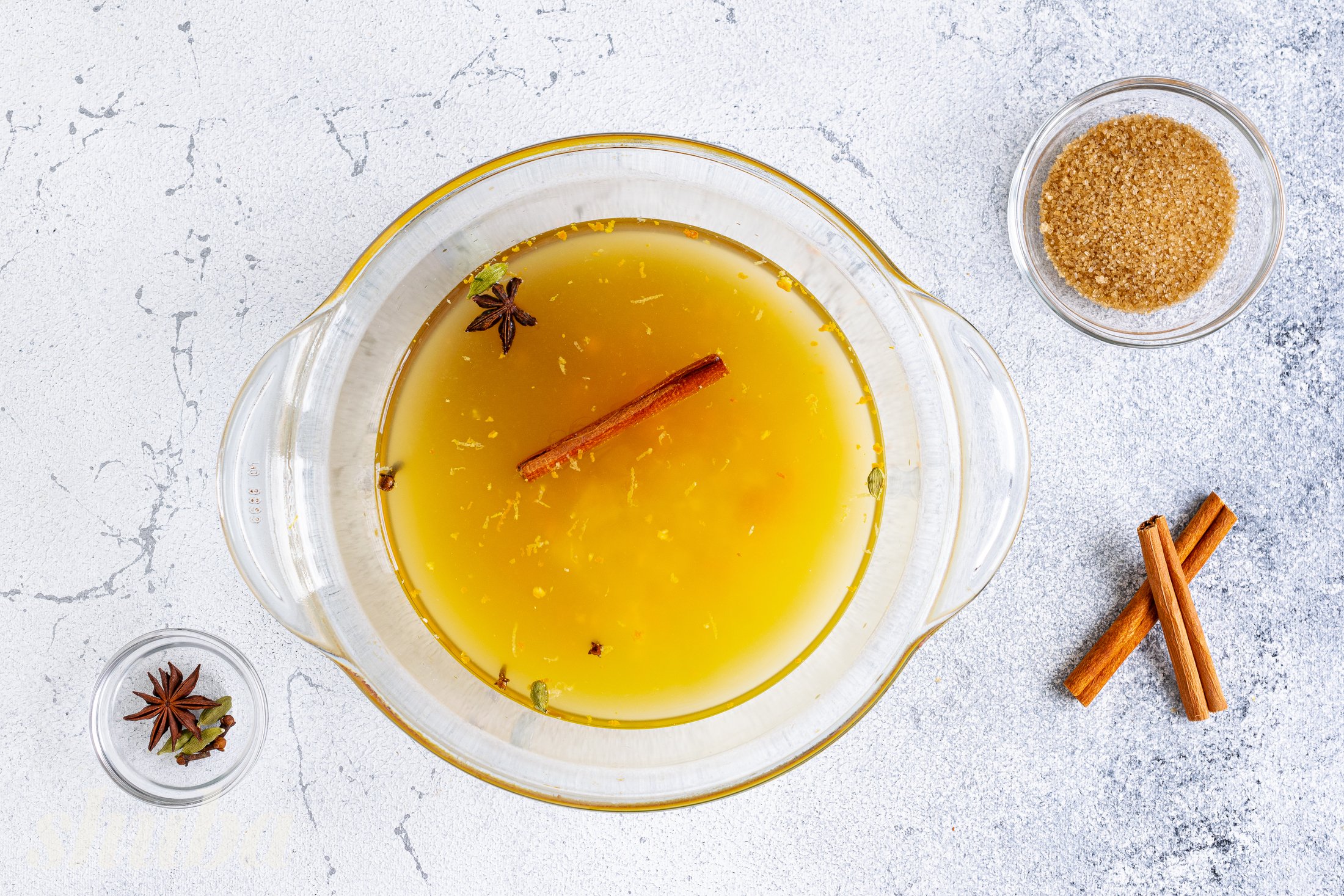 Всип тростинний цукор, додай корицю, кардамон, аніс і гвоздику. Доведи суміш до кипіння, після чого провари кілька хвилин, щоб цукор повністю розчинився, а спеції віддали аромат.