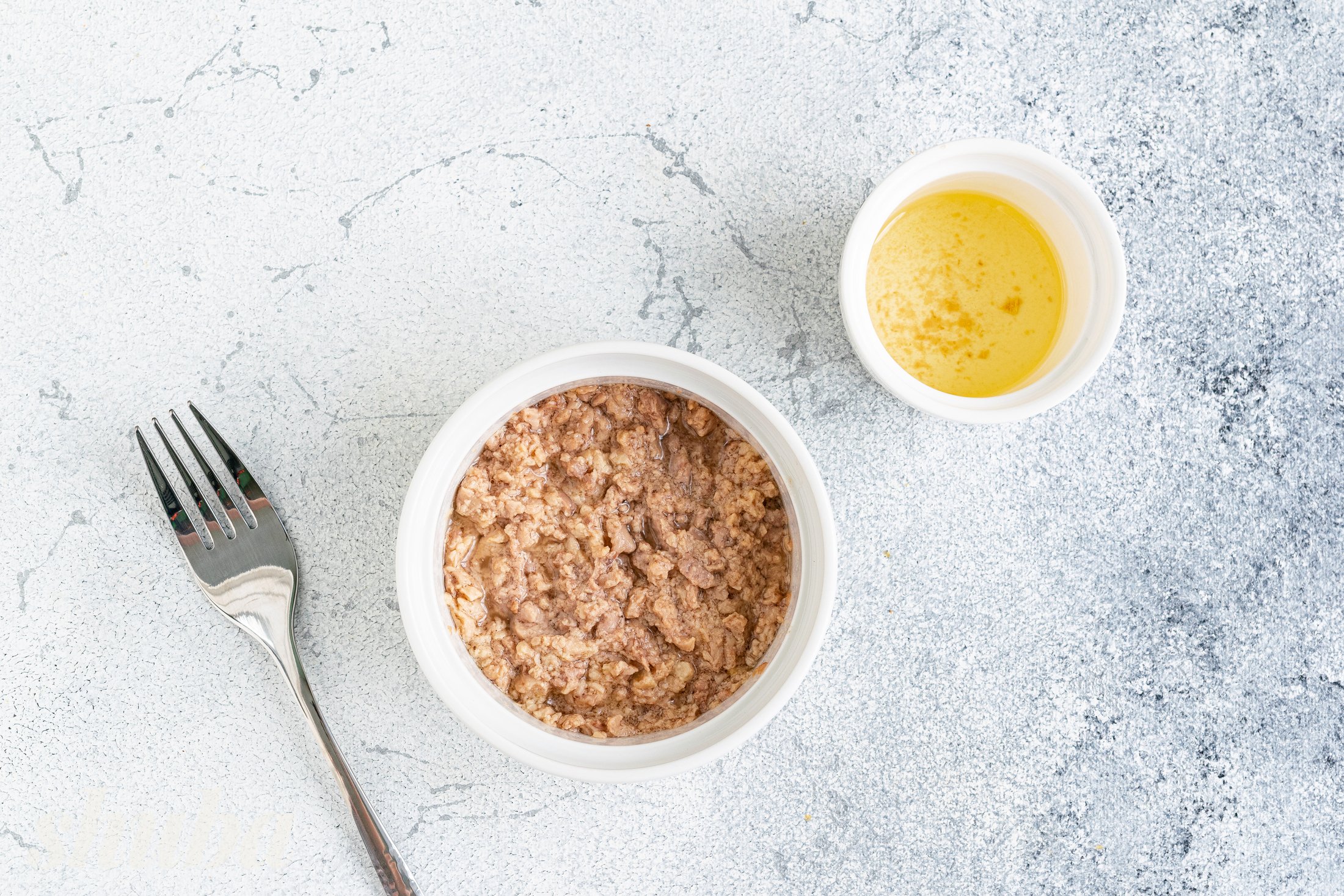 Відкрий банку з консервами. Злий в окрему посудину олію, розімни печінку тріски виделкою до однорідної консистенції.