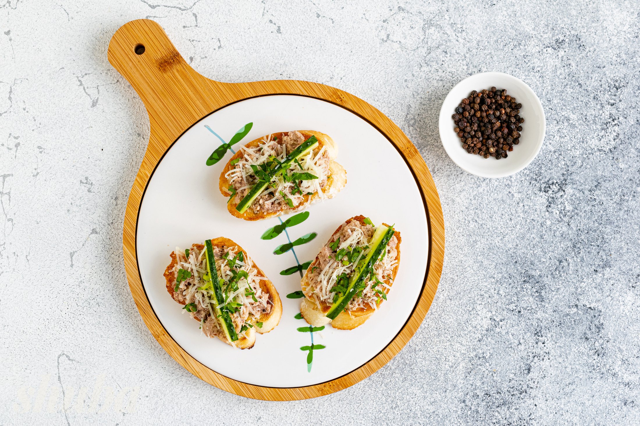 Поверх розклади печінку тріски. Зверху додай сир та зелень, що залишилися. Прикрась кростіні свіжим огірком. Приправ чорним меленим перцем.