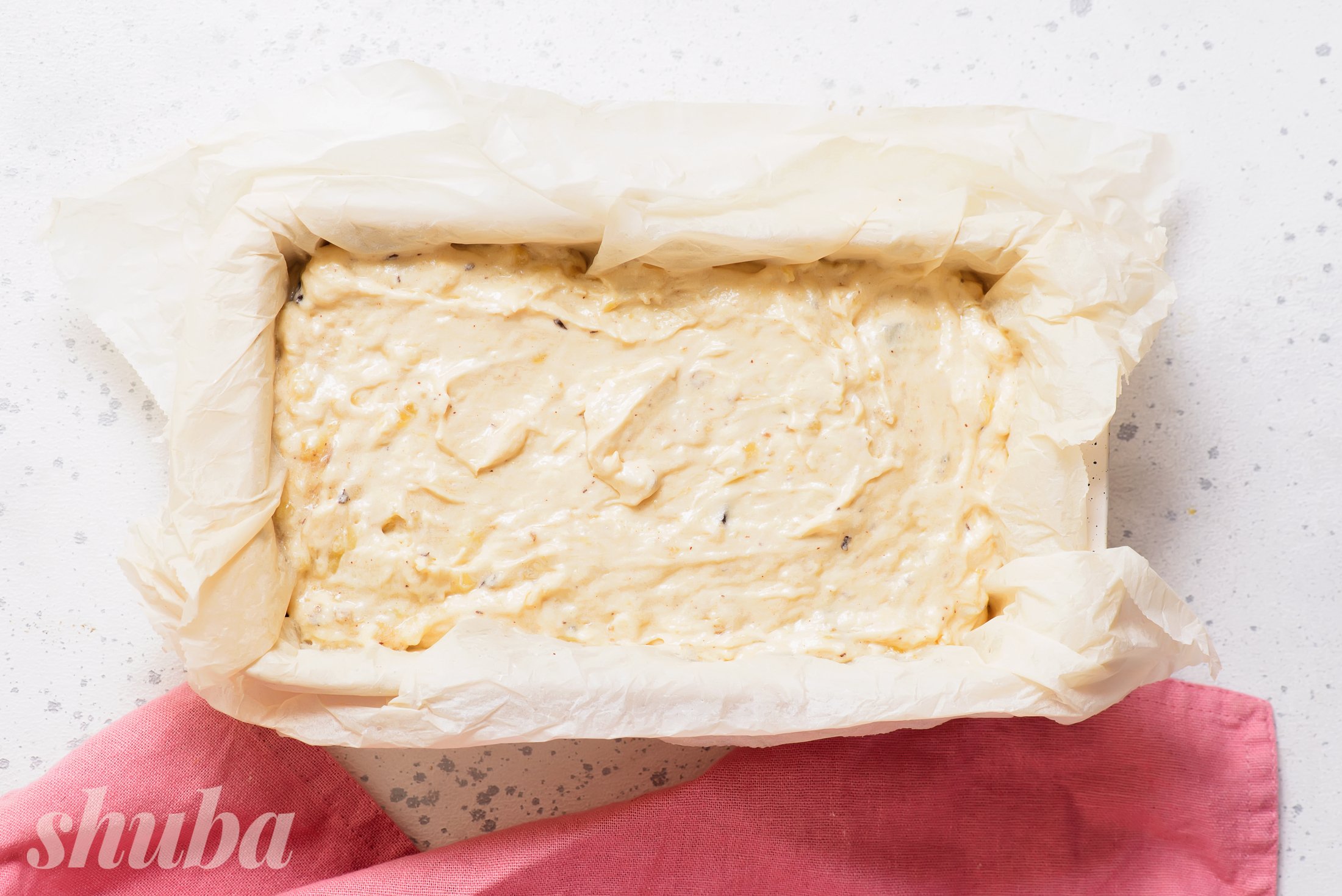 Прямокутну форму для кексу застели пергаментом та виклади в неї тісто, розрівняй поверхню.