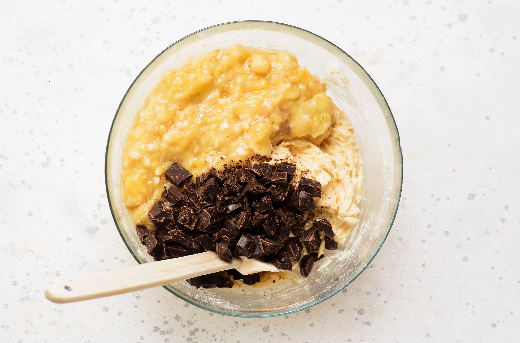 Банани розімни виделкою до каші. Шоколад подрібни ножем та додай все це у тісто.