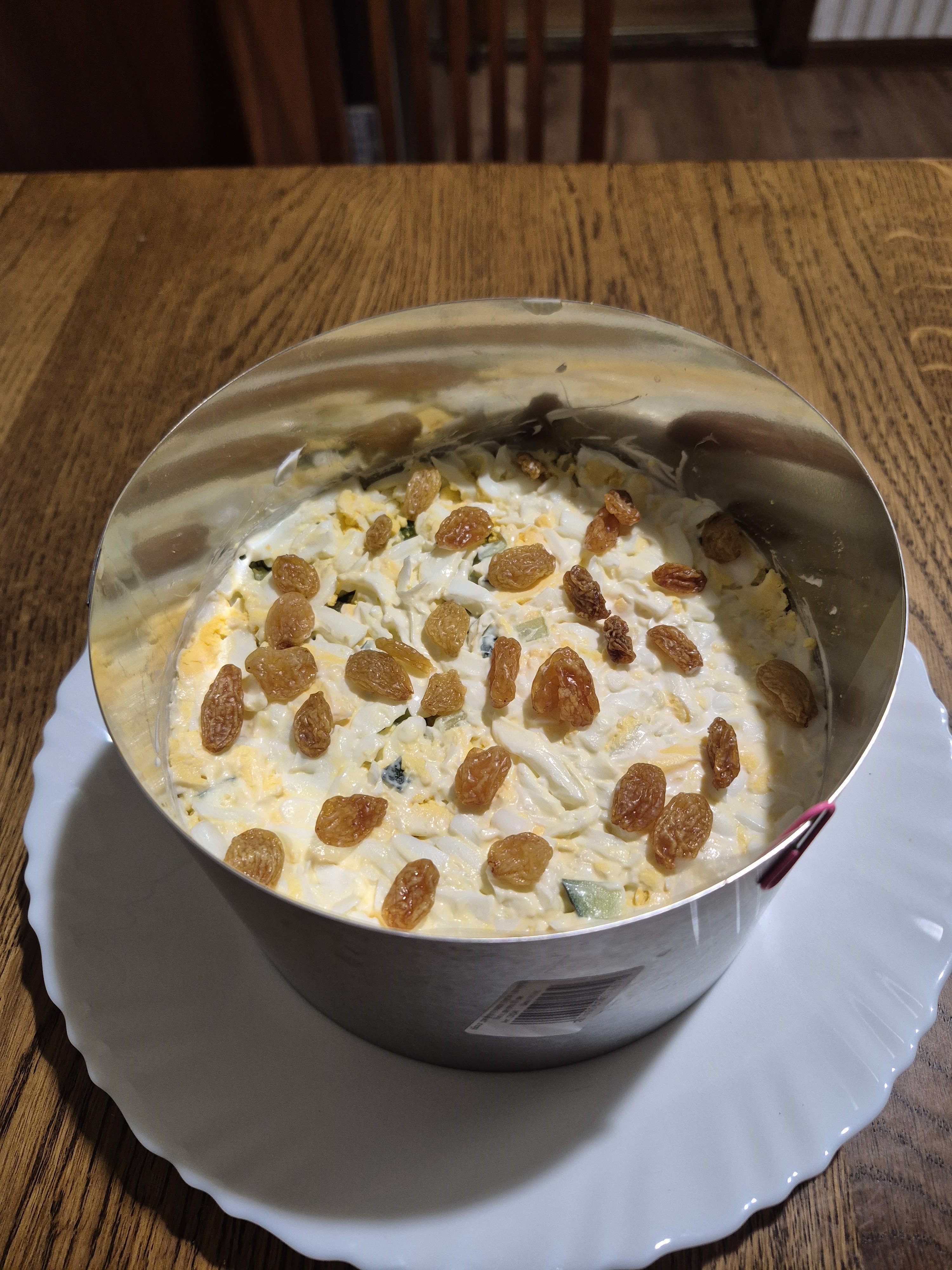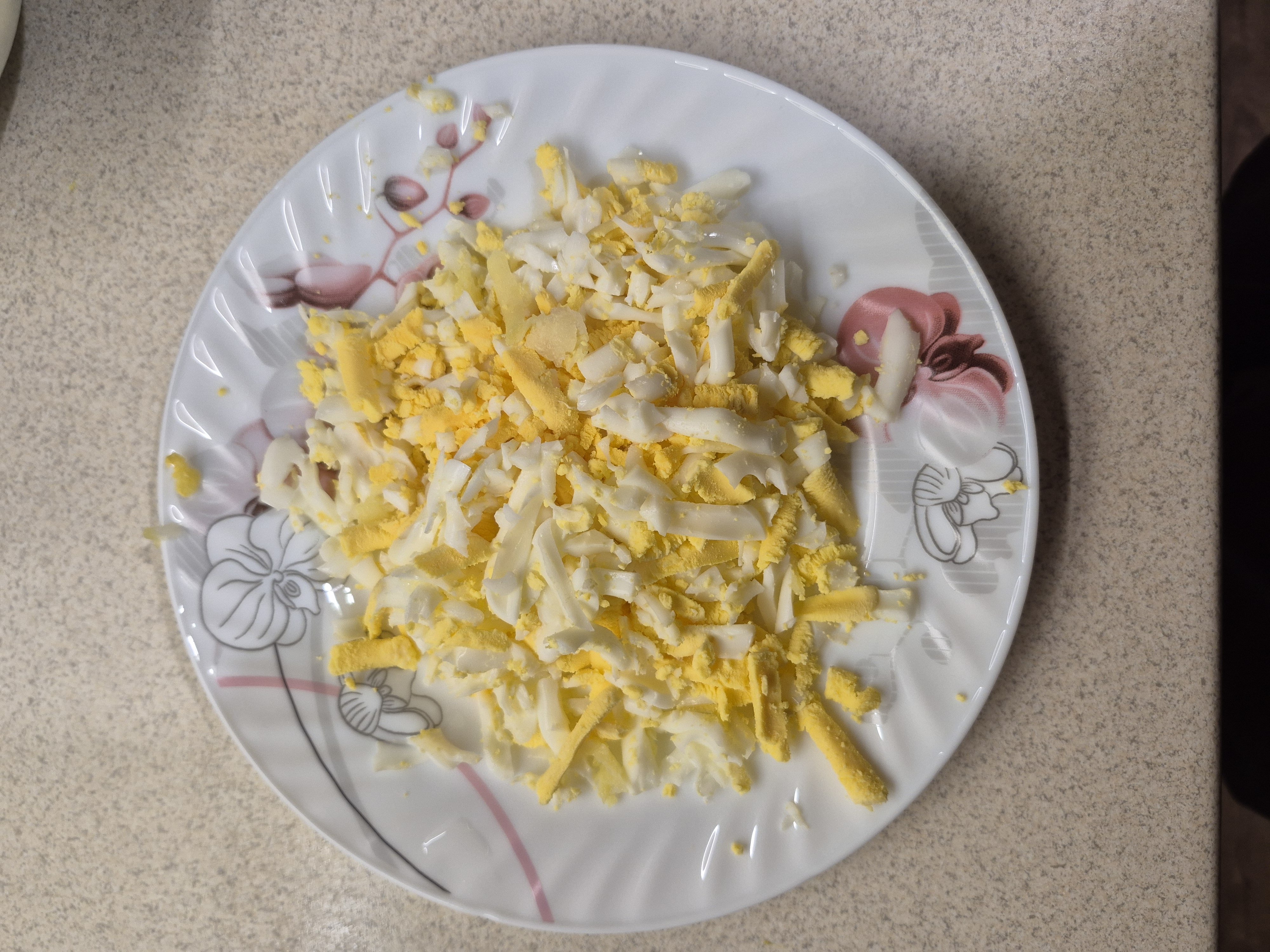 Починаємо з того, що зваримо яйця круто, картоплю в кожушках до м’якості, родзинки запаримо окропом. Традиційно радимо самостійно зробити моркву по-корейськи і домашній майонез.