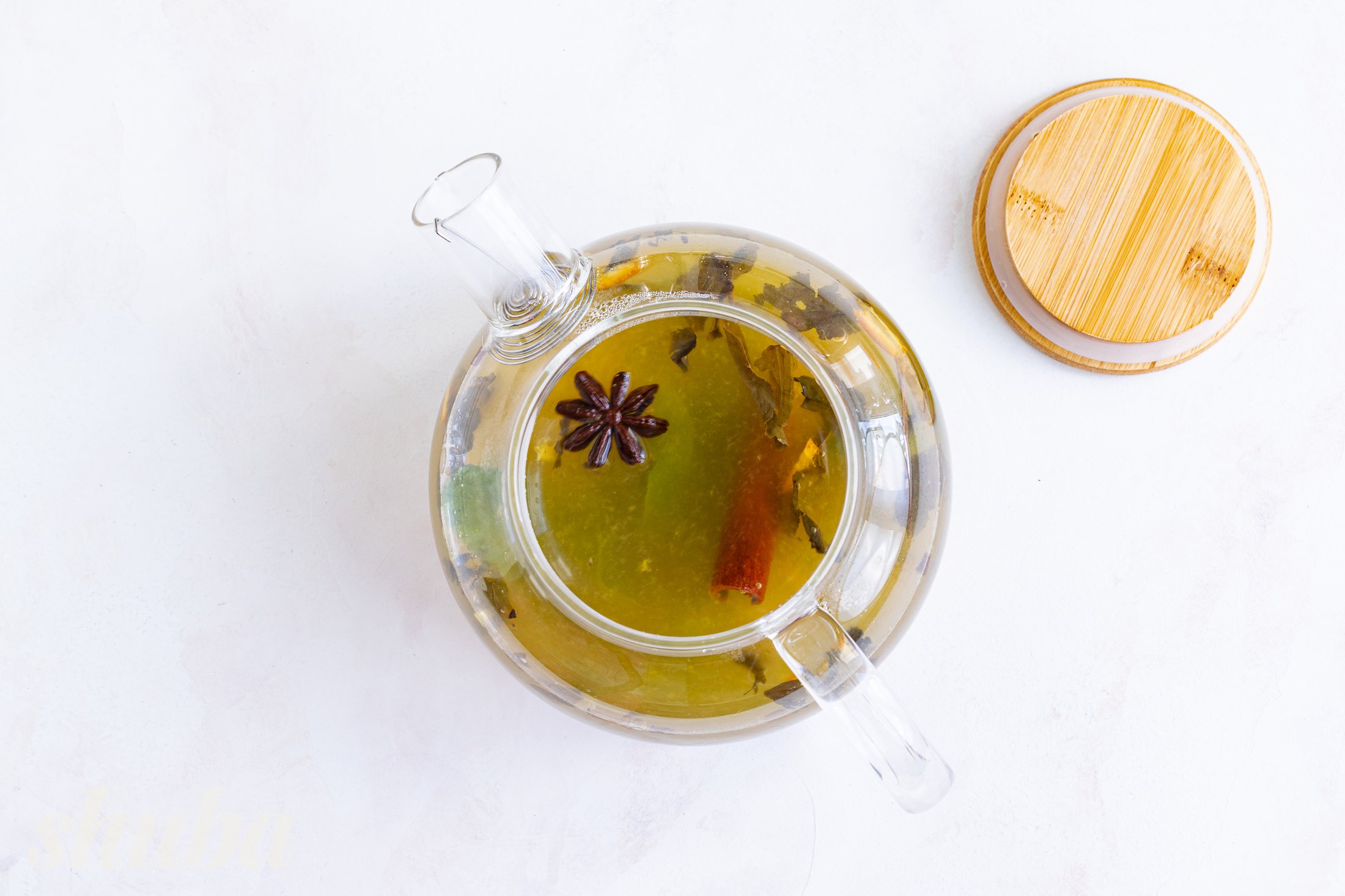 Переклади мандаринове пюре у заварник, додай цедру, всип зелений чай. Додай гілочки м’яти та розмарину, паличку кориці та бадьян для аромату.