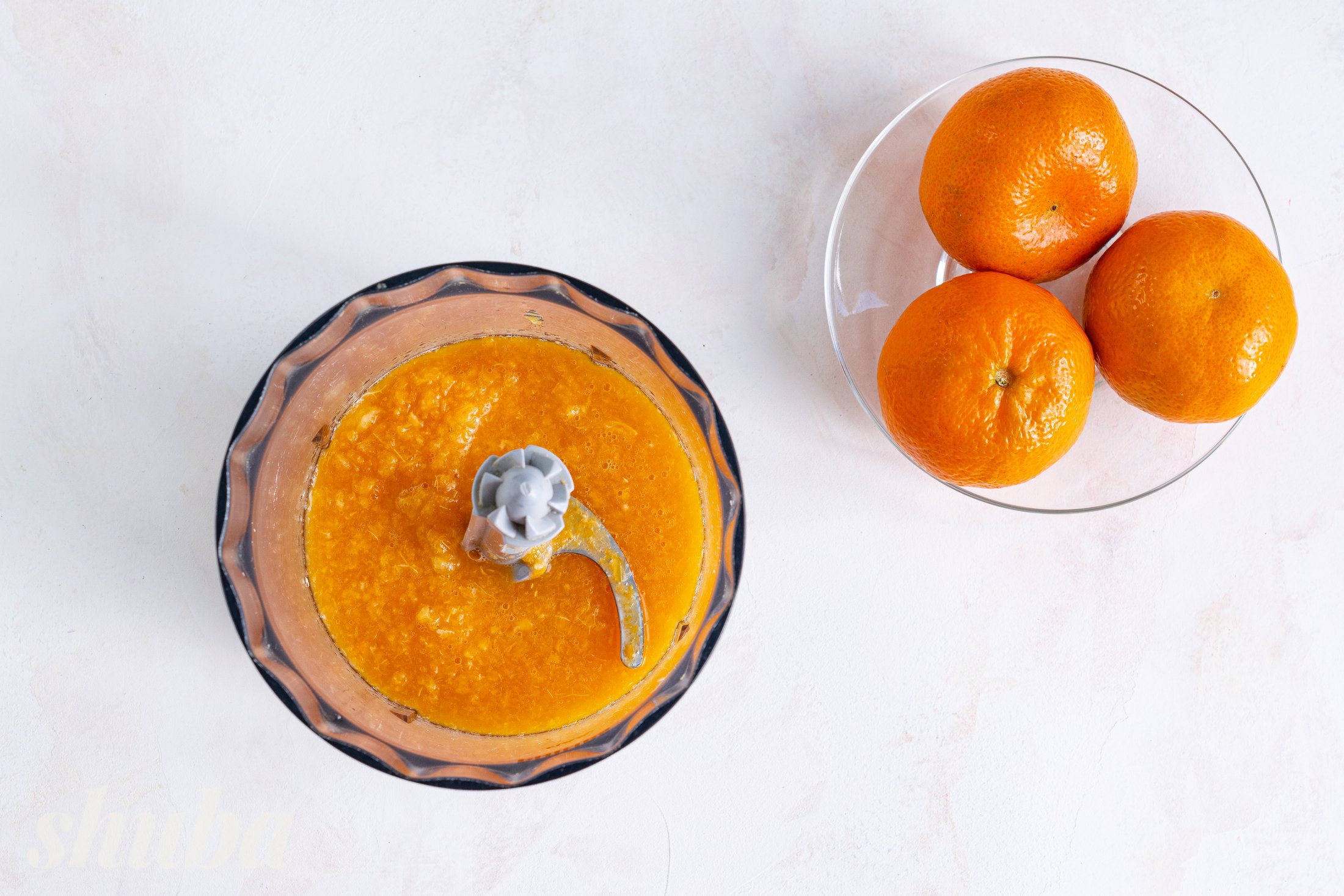 Мандарини ретельно помий під холодною водою. Зніми шкірку, залиши трішки цедри для аромату (без білої гіркої частини). Розділи очищені мандарини на часточки та поклади їх у блендер. Збивай фрукти 1-2 хвилини до однорідної консистенції.
