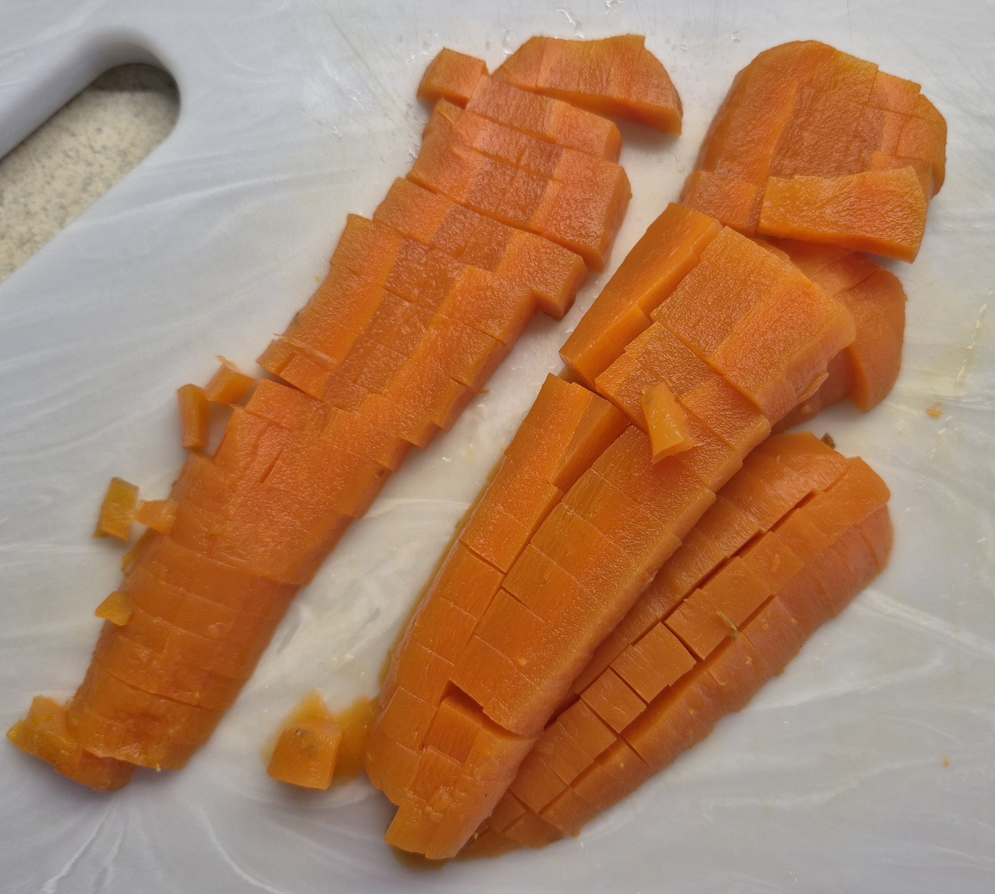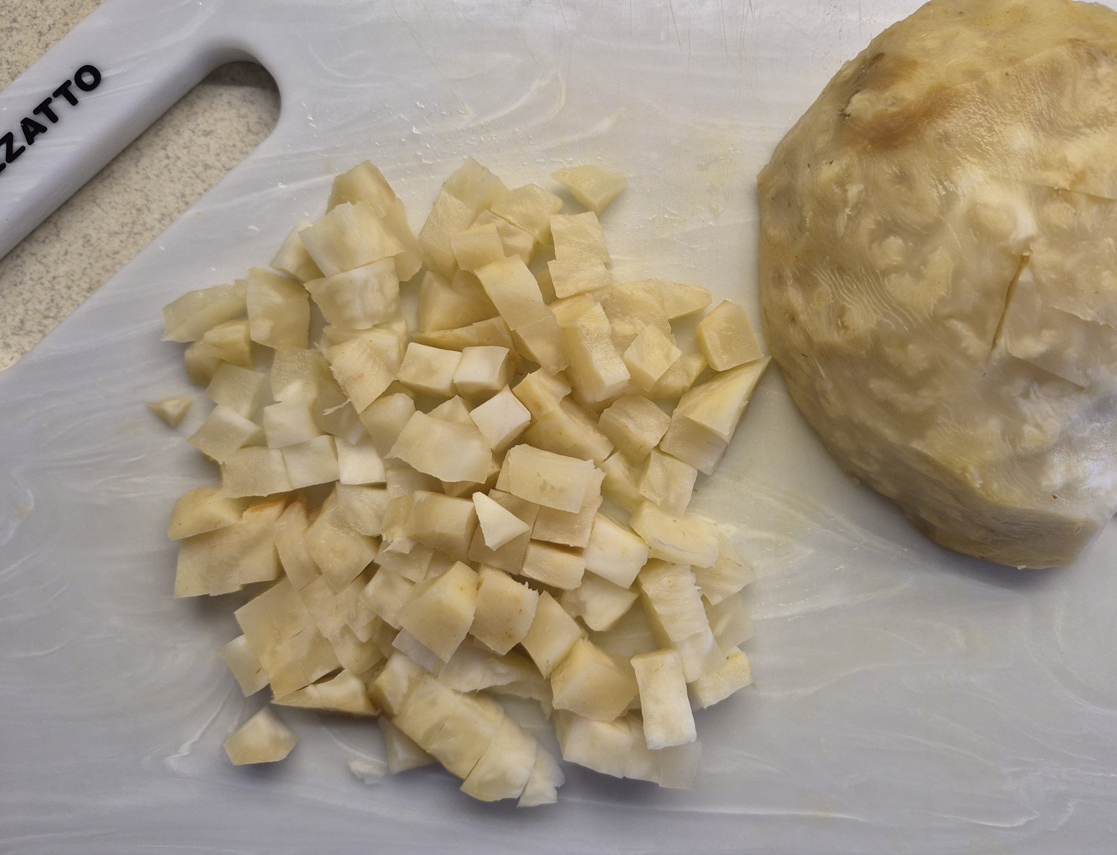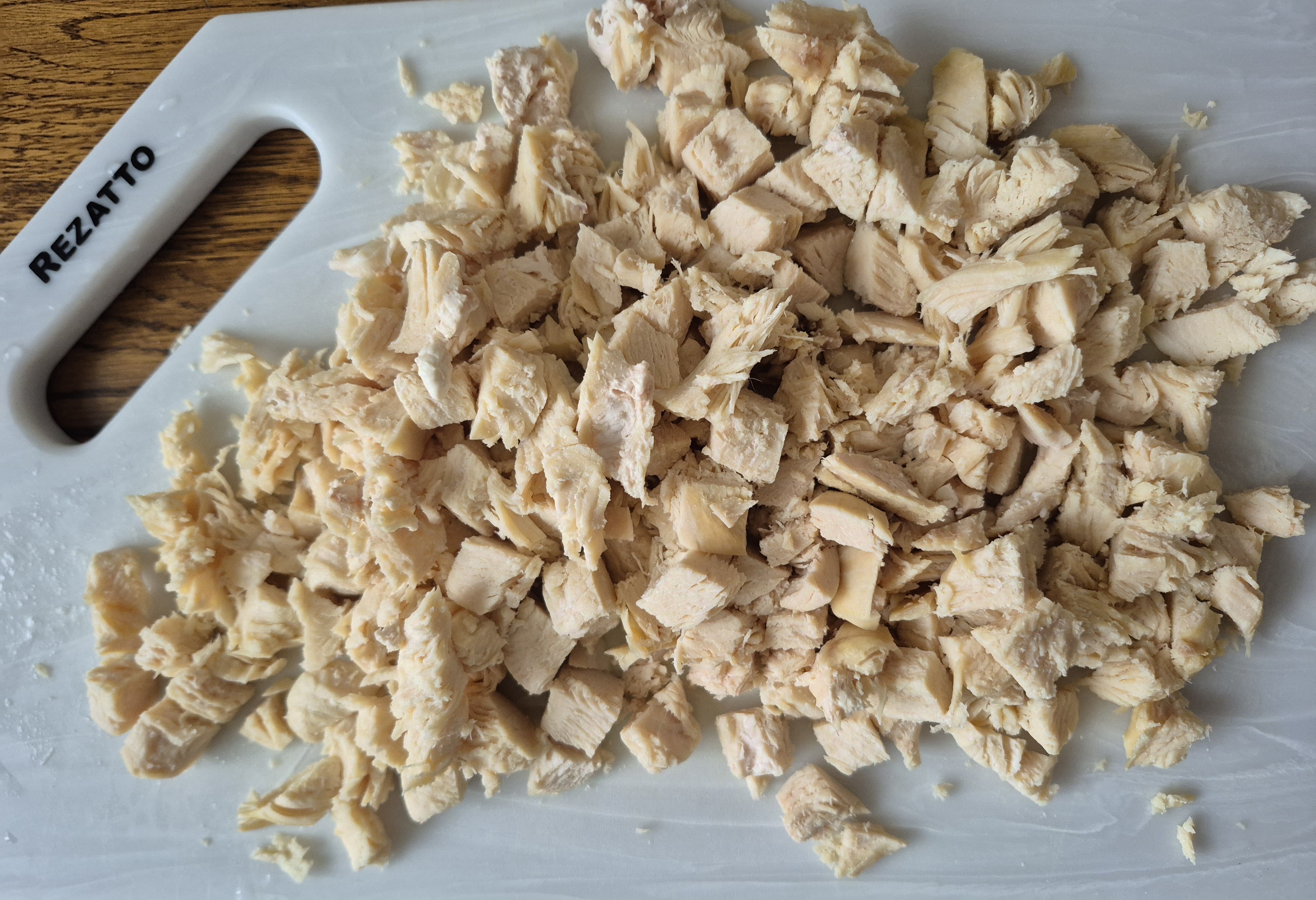 Тому заздалегідь звари куряче філе протягом 30 хв після закипання, картоплю звари в кожушках до готовності, яйця 7-9 хв після закипання, а корінь селери та моркву — 30-35 хв після закипання.