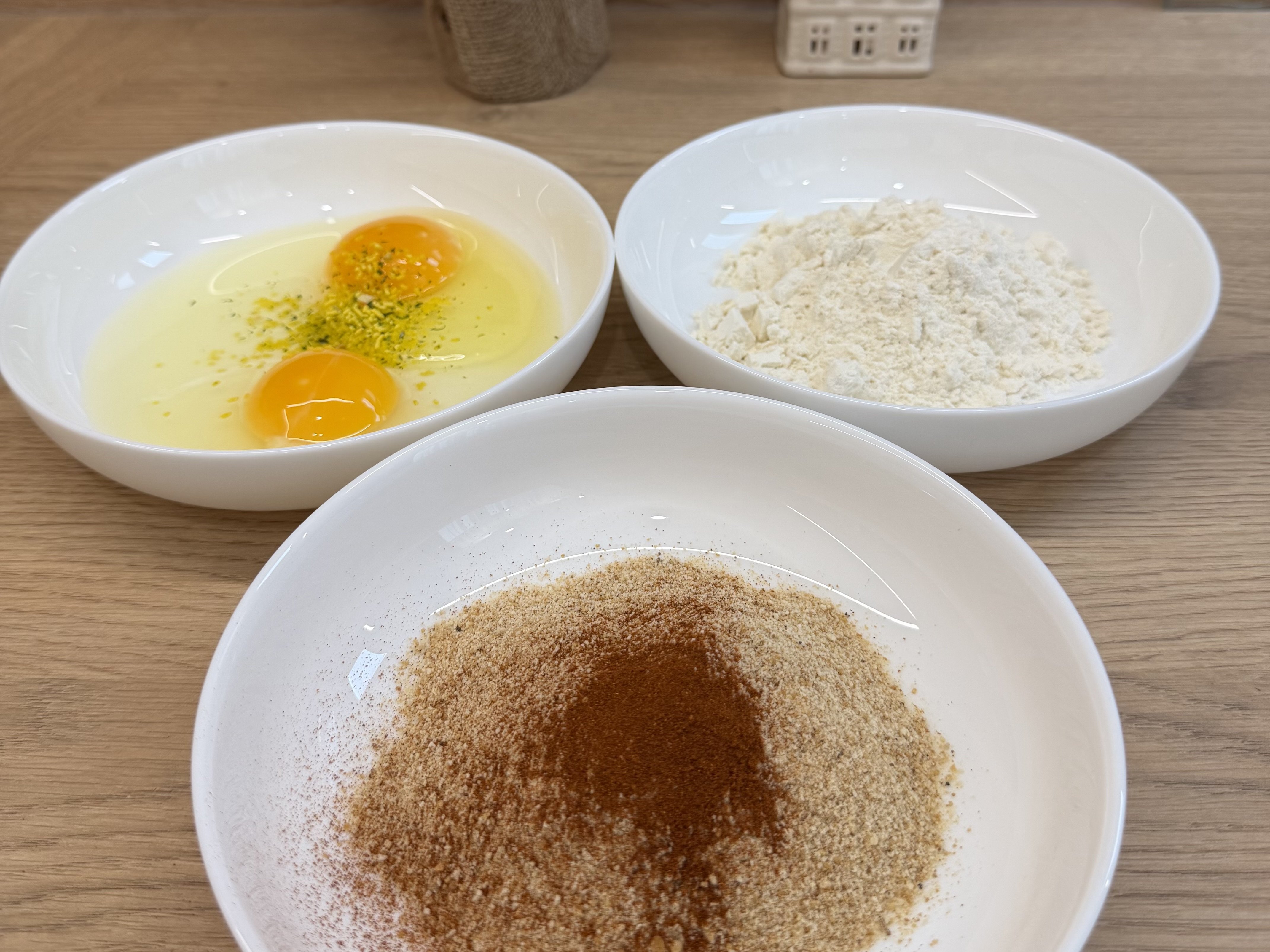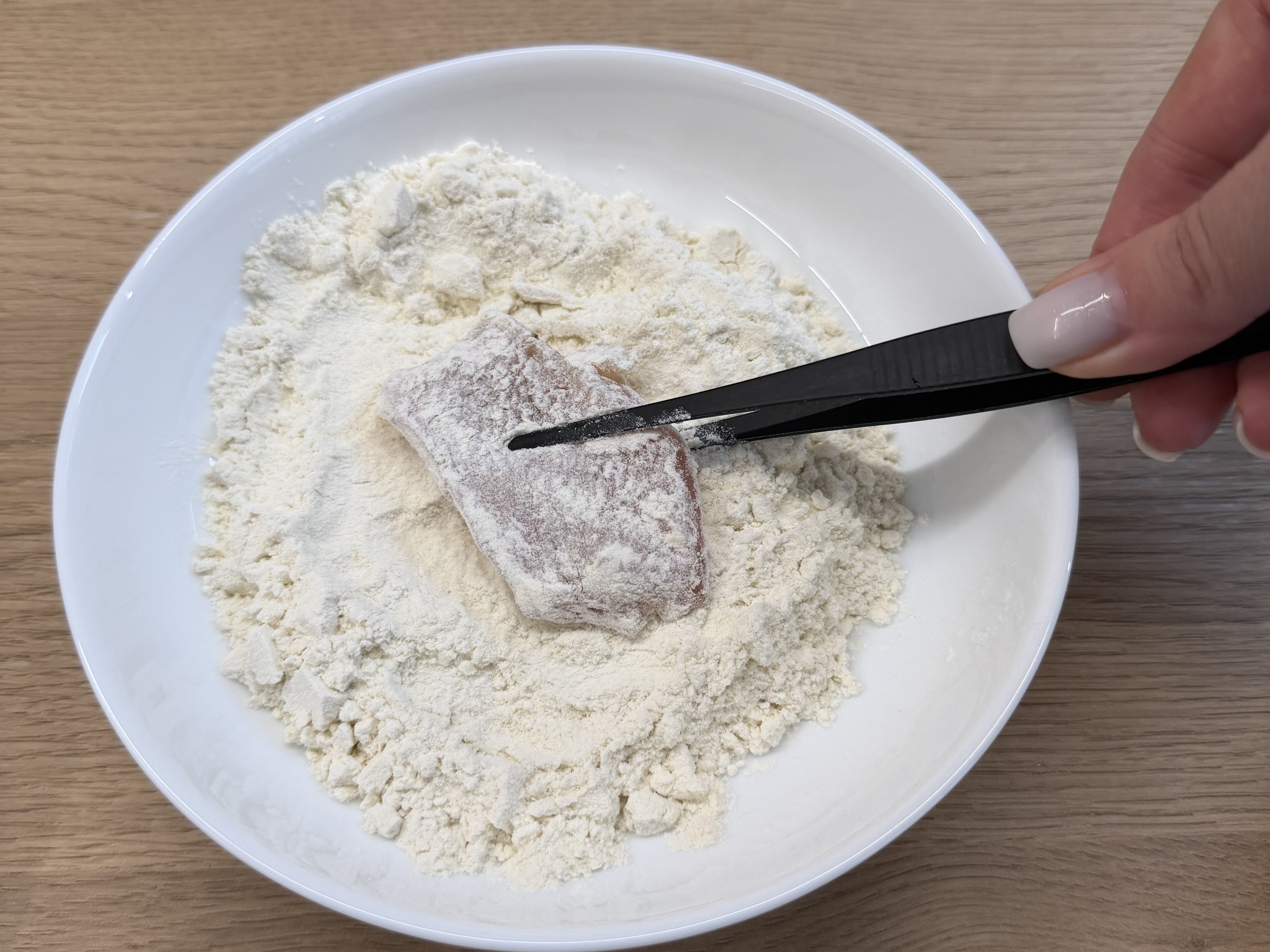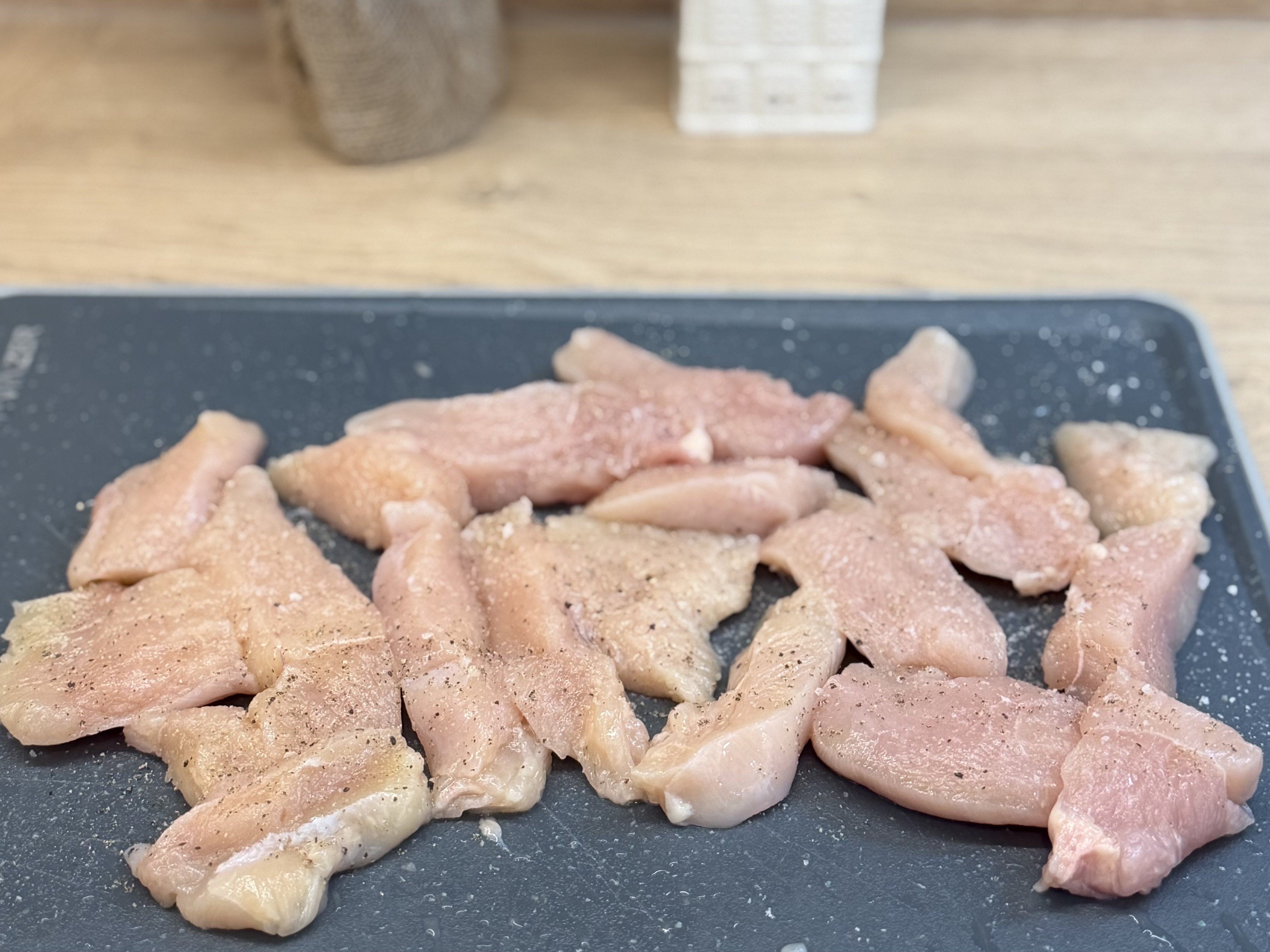 Після того як наріжеш куряче філе однаковими довгастими шматками, їх потрібно запанірувати. У нас буде потрійне панірування: борошно, яйця та сухарі.