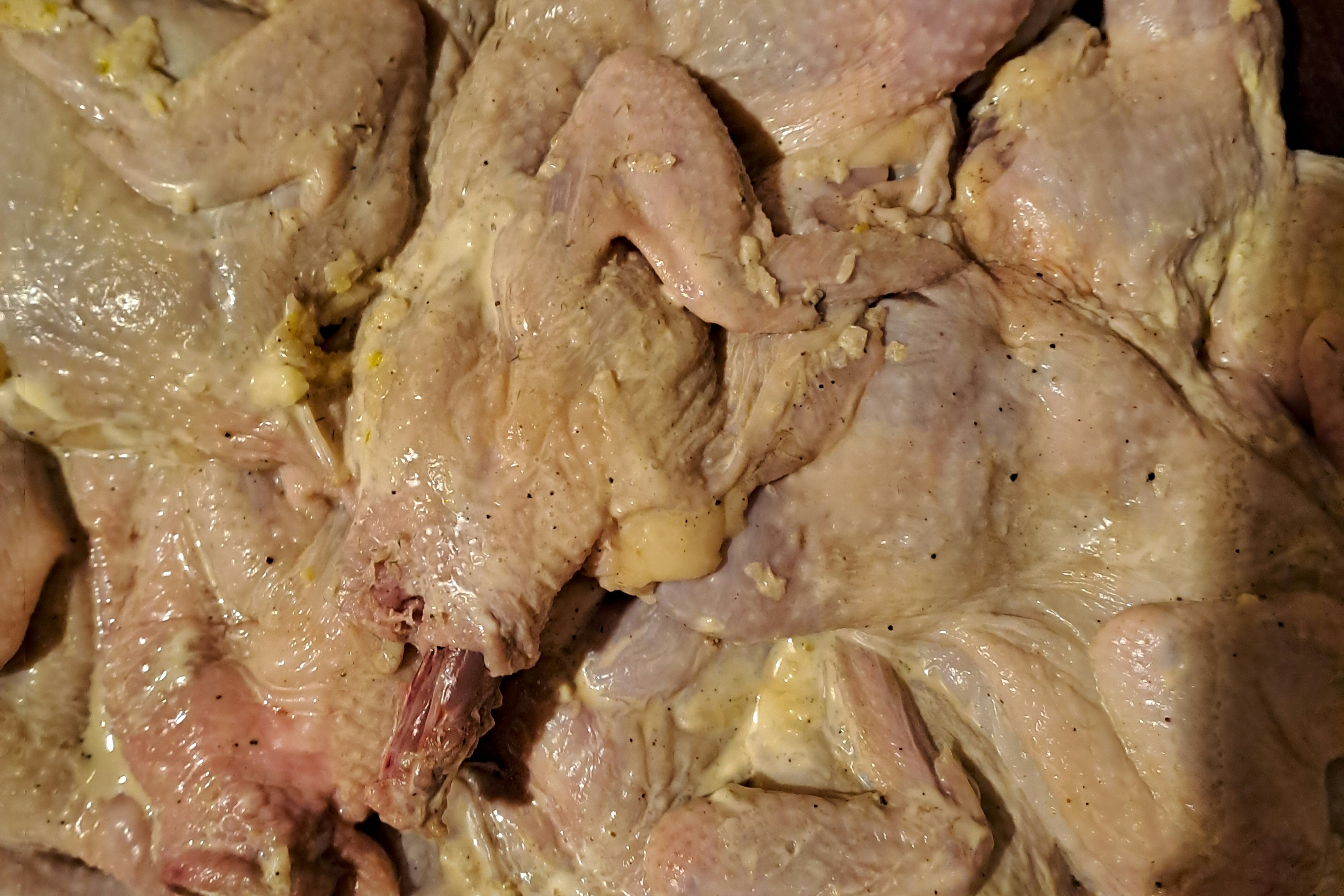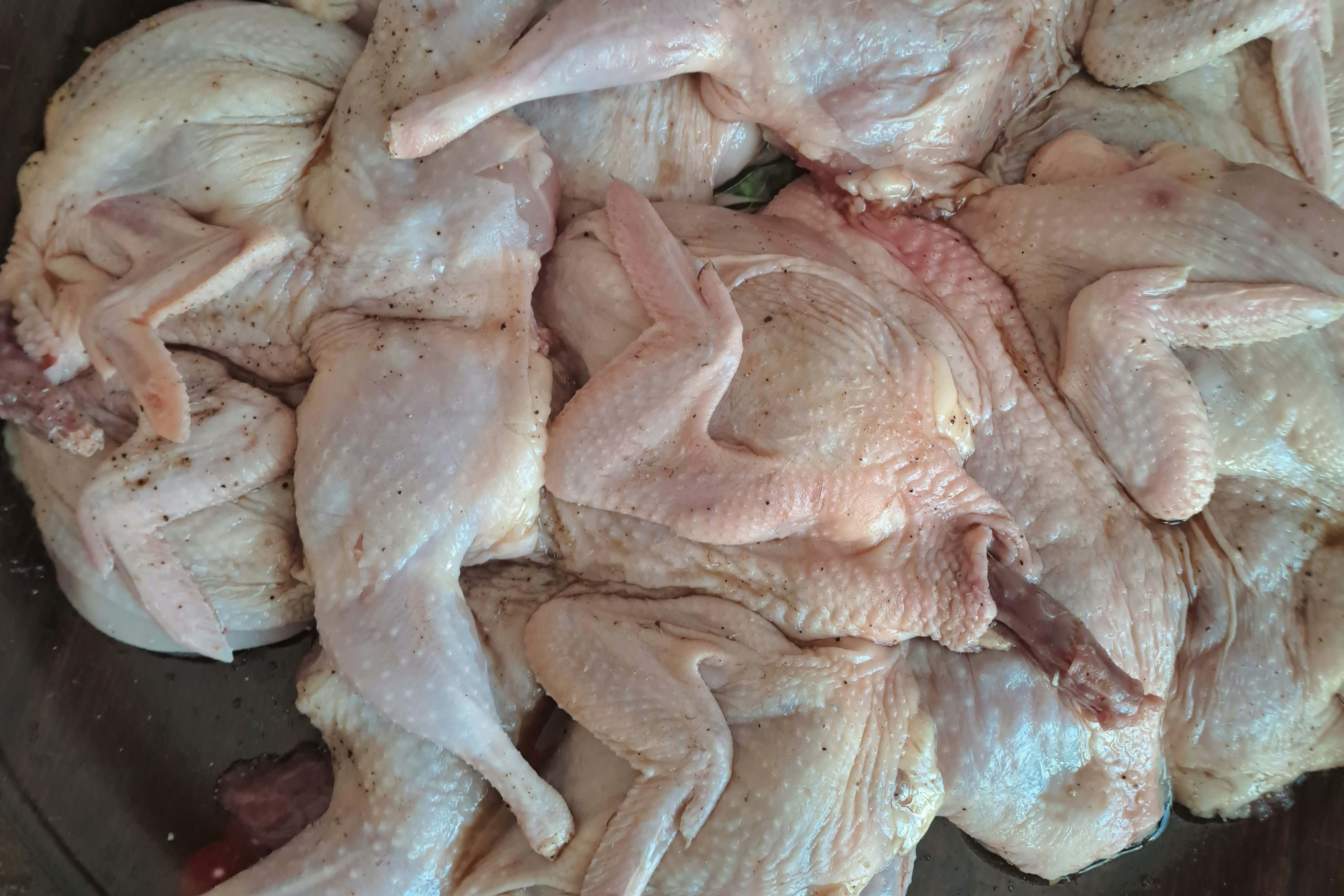 Авторка рецепта пропонує два варіанти. Перший — не чіпати тушки й просто натерти спеціями. Другий — розрізати їх вздовж у вигляді метеликів і відбити молотком. Замість свіжого часнику можна взяти сушений.