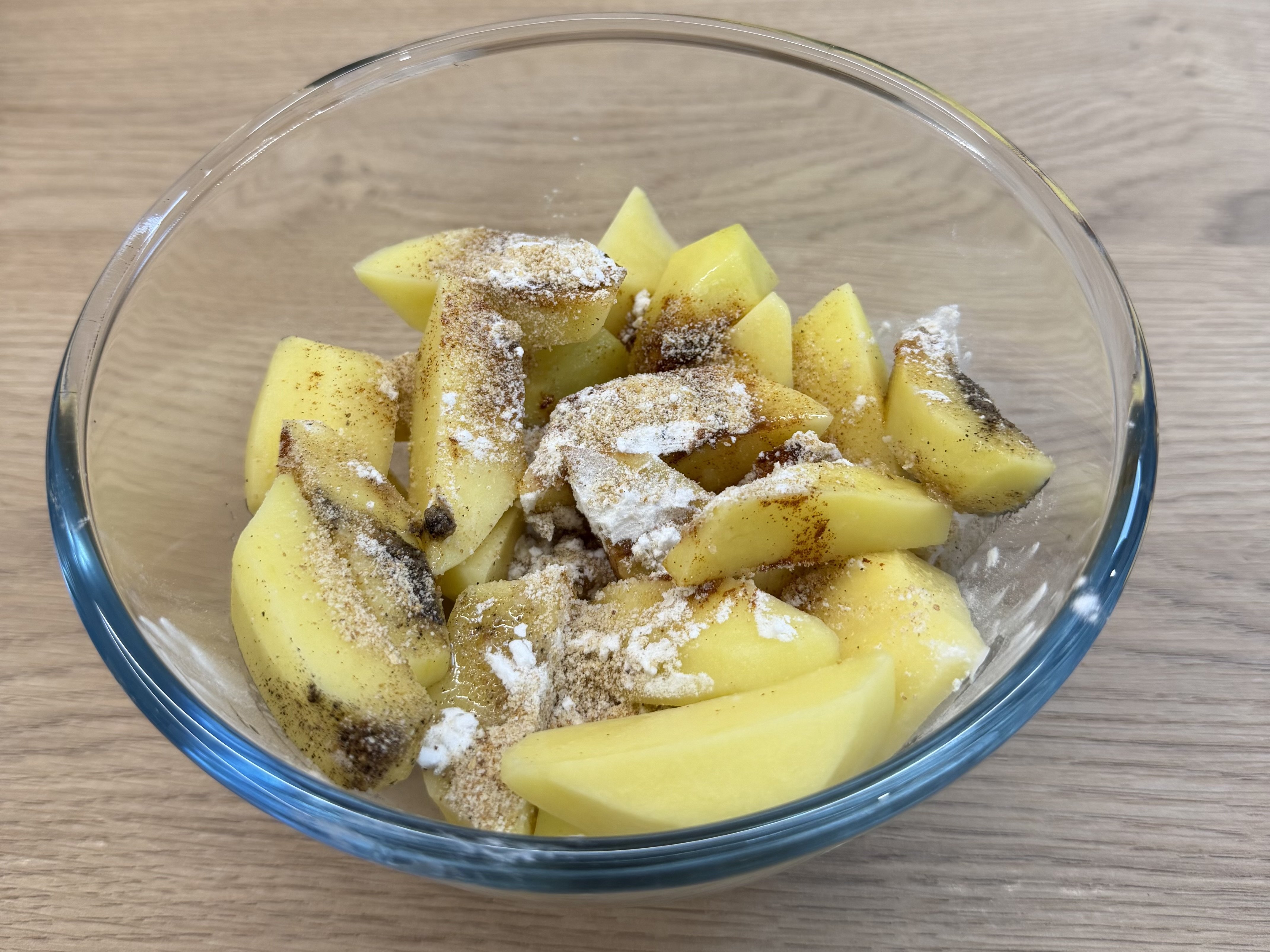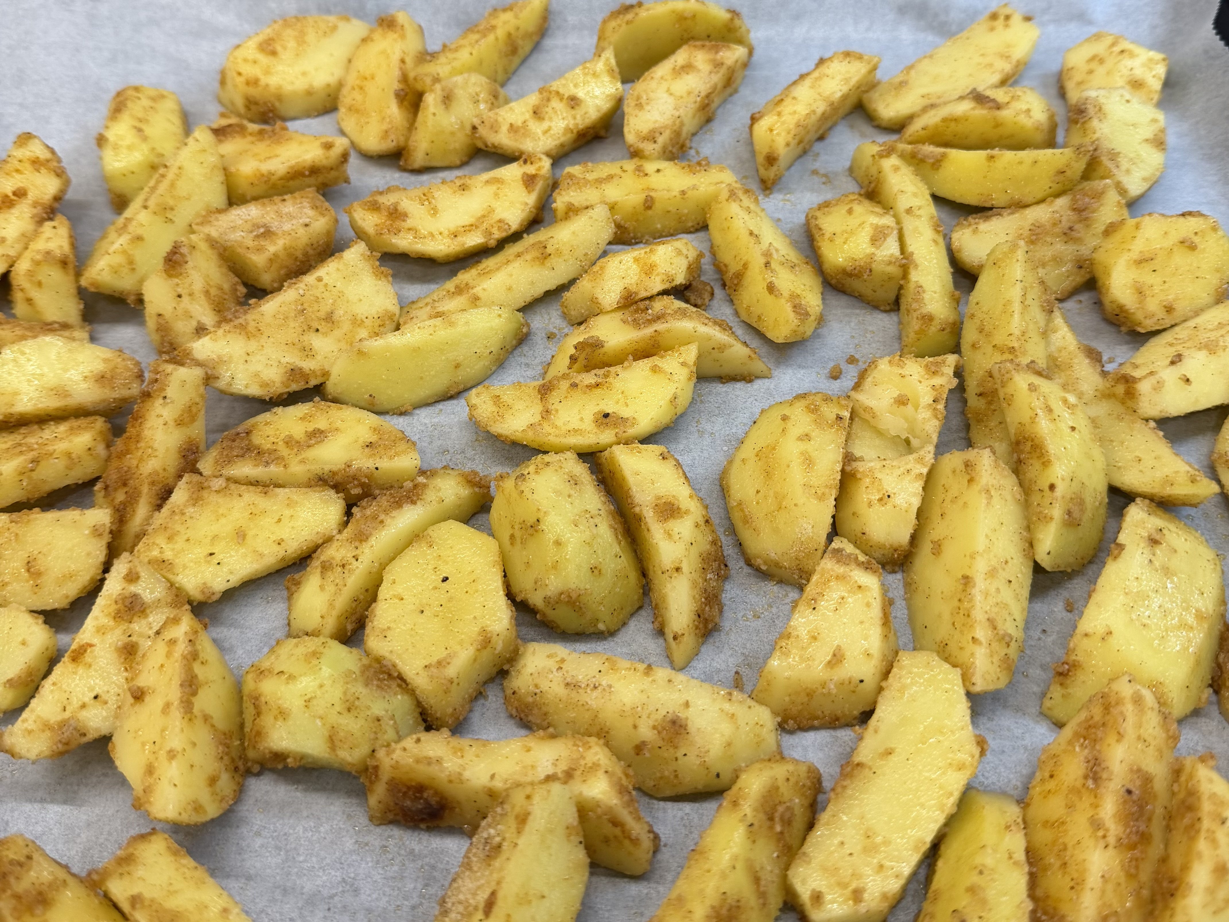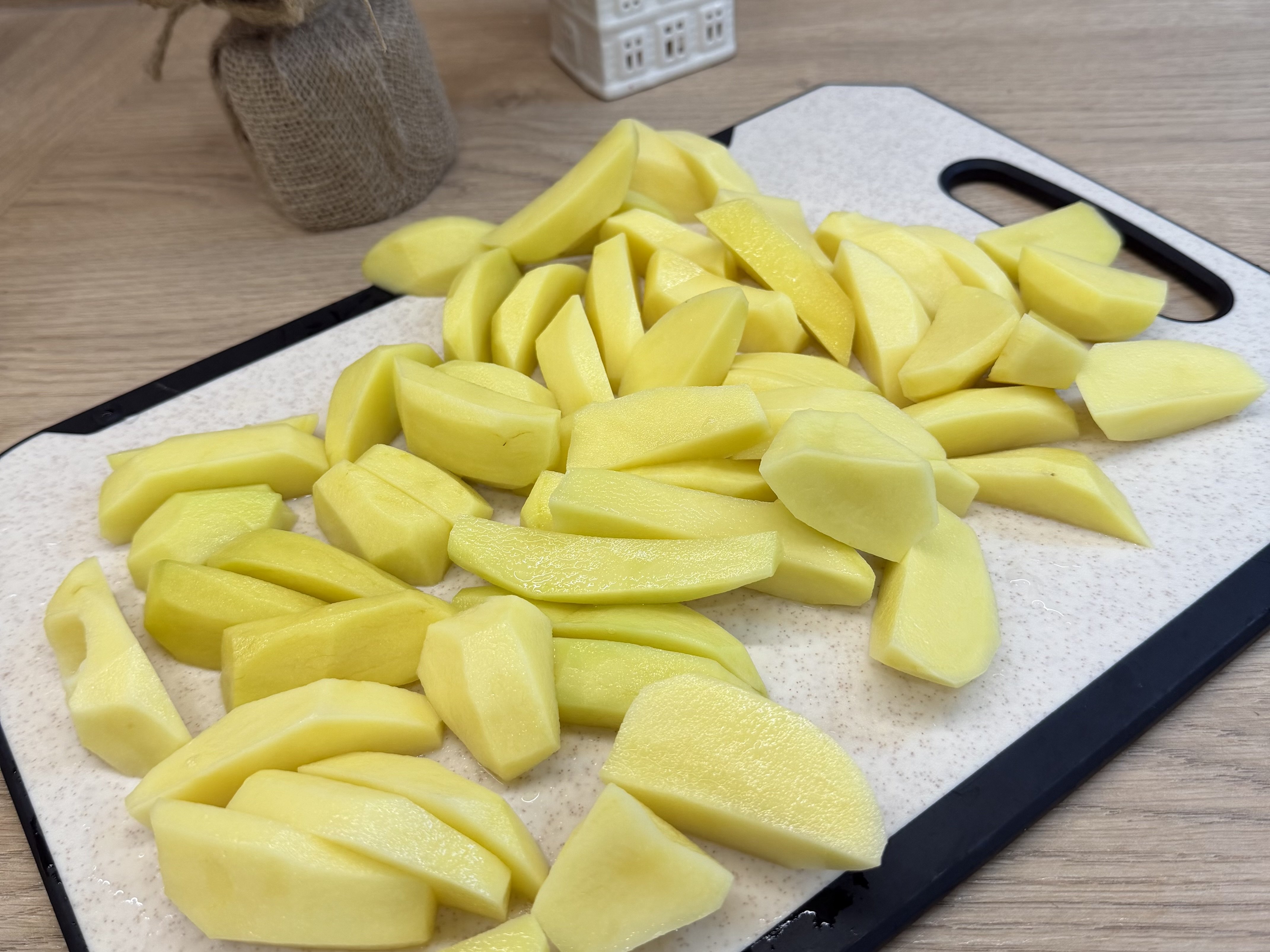Ідеально, якщо буде сорт картоплі саме для смаження або запікання. Нарізати її потрібно скибками однакової товщини, щоб усе пропеклося рівномірно. Під час запікання перемішай картоплю декілька разів.