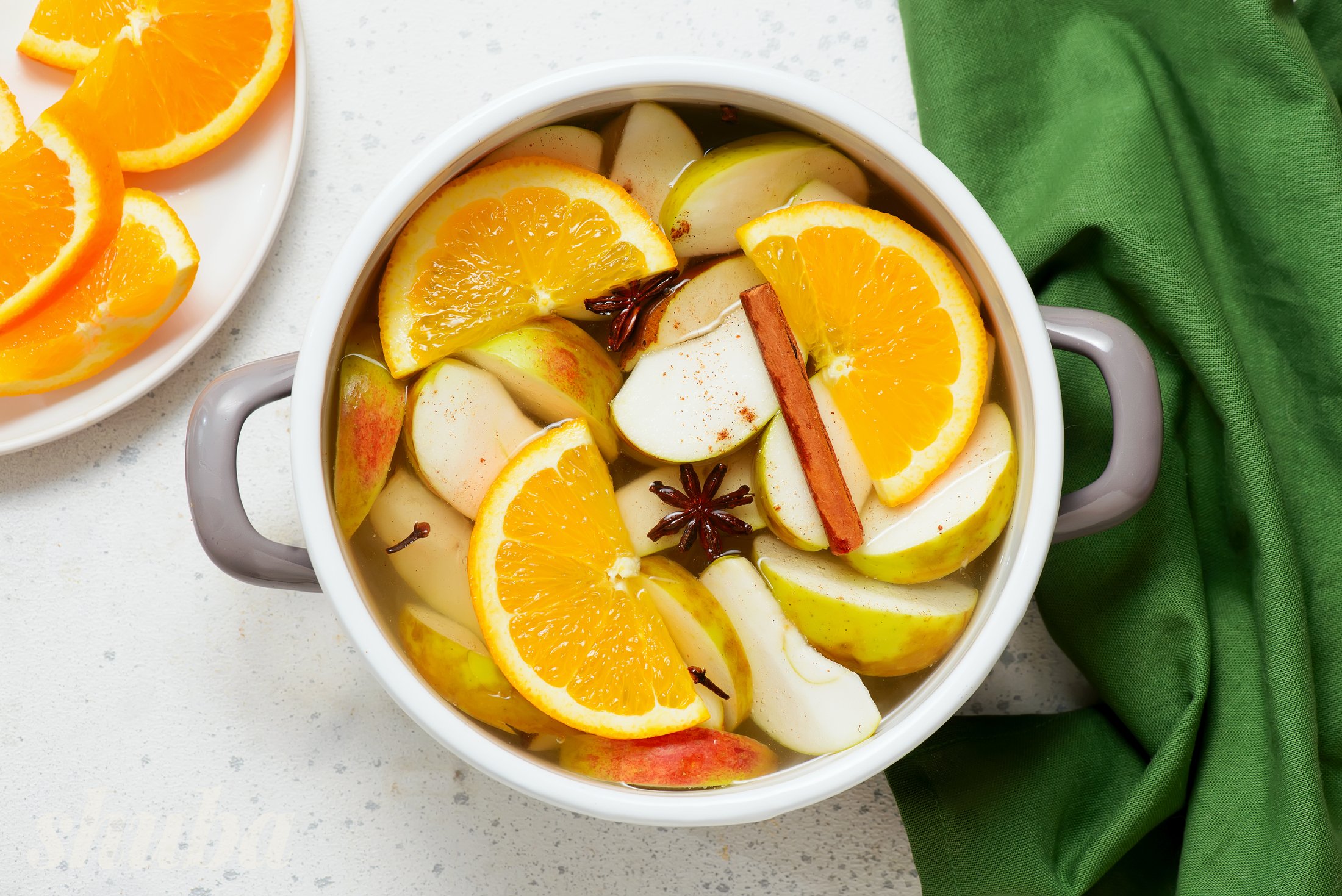 У каструлю влий воду, додай спеції та доведи до кипіння. Зменш вогонь і вари близько 5 хвилин, щоб аромат розкрився. Додай яблука, груші й підсолоджувач, знову доведи до кипіння та вари на слабкому вогні 15 хвилин.