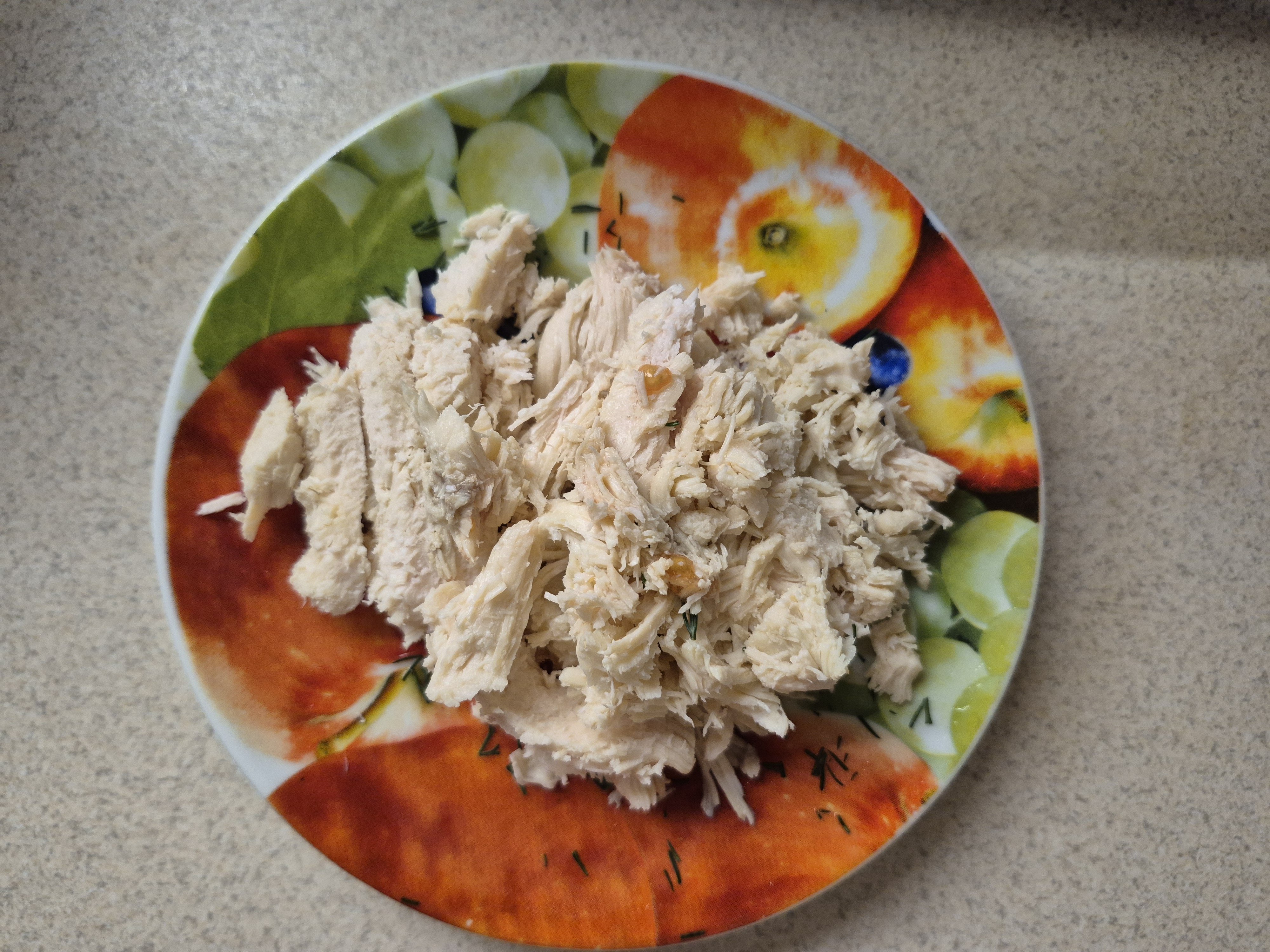 Смак цього простого салату з куркою залежить від звареного філе. Тому порадимо посолити, поперчити й навіть покласти лавровий лист під час варіння м`яса.