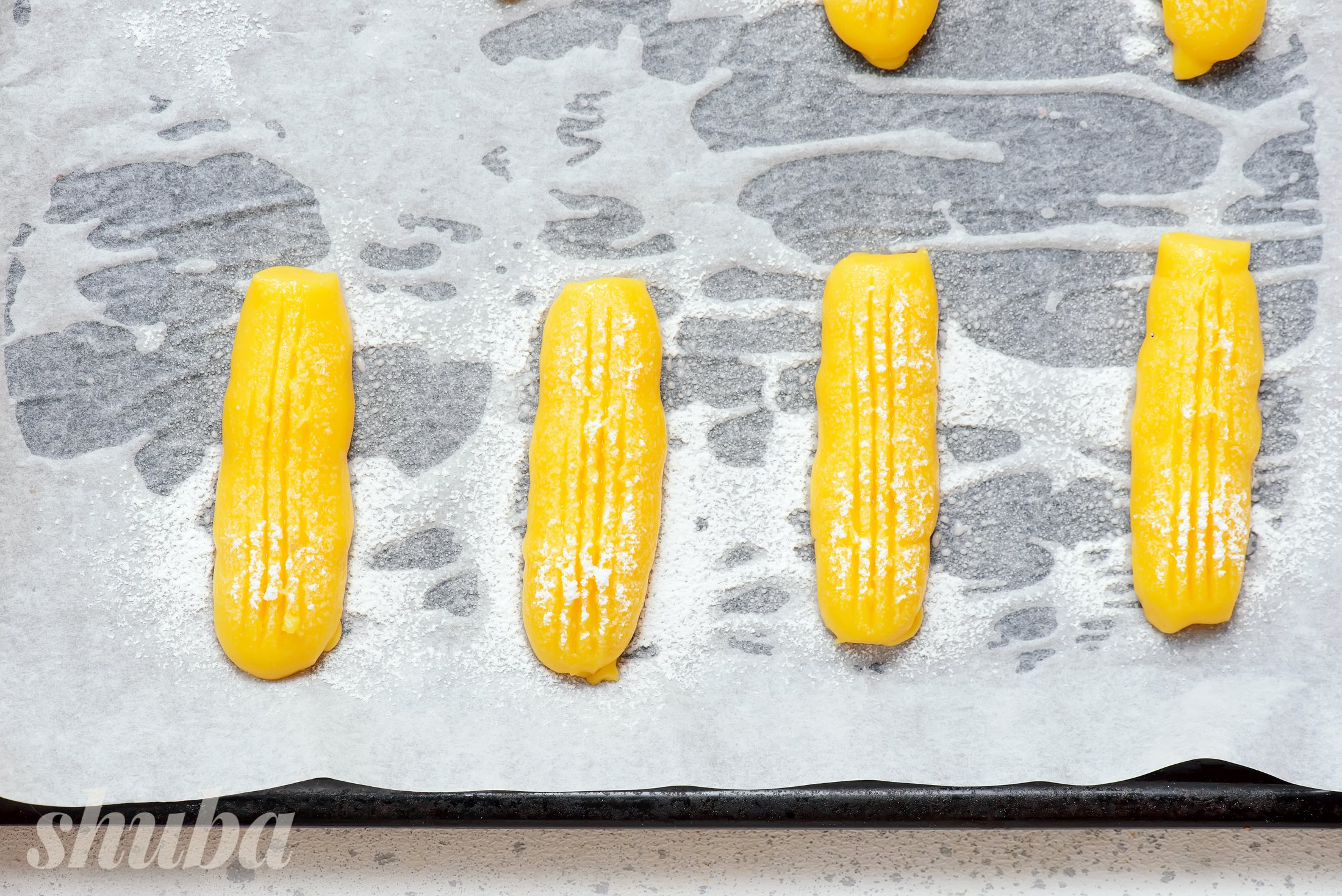 Переклади тісто в кондитерський мішок, відсаджуй смужки на деко та тричі присип цукровою пудрою.