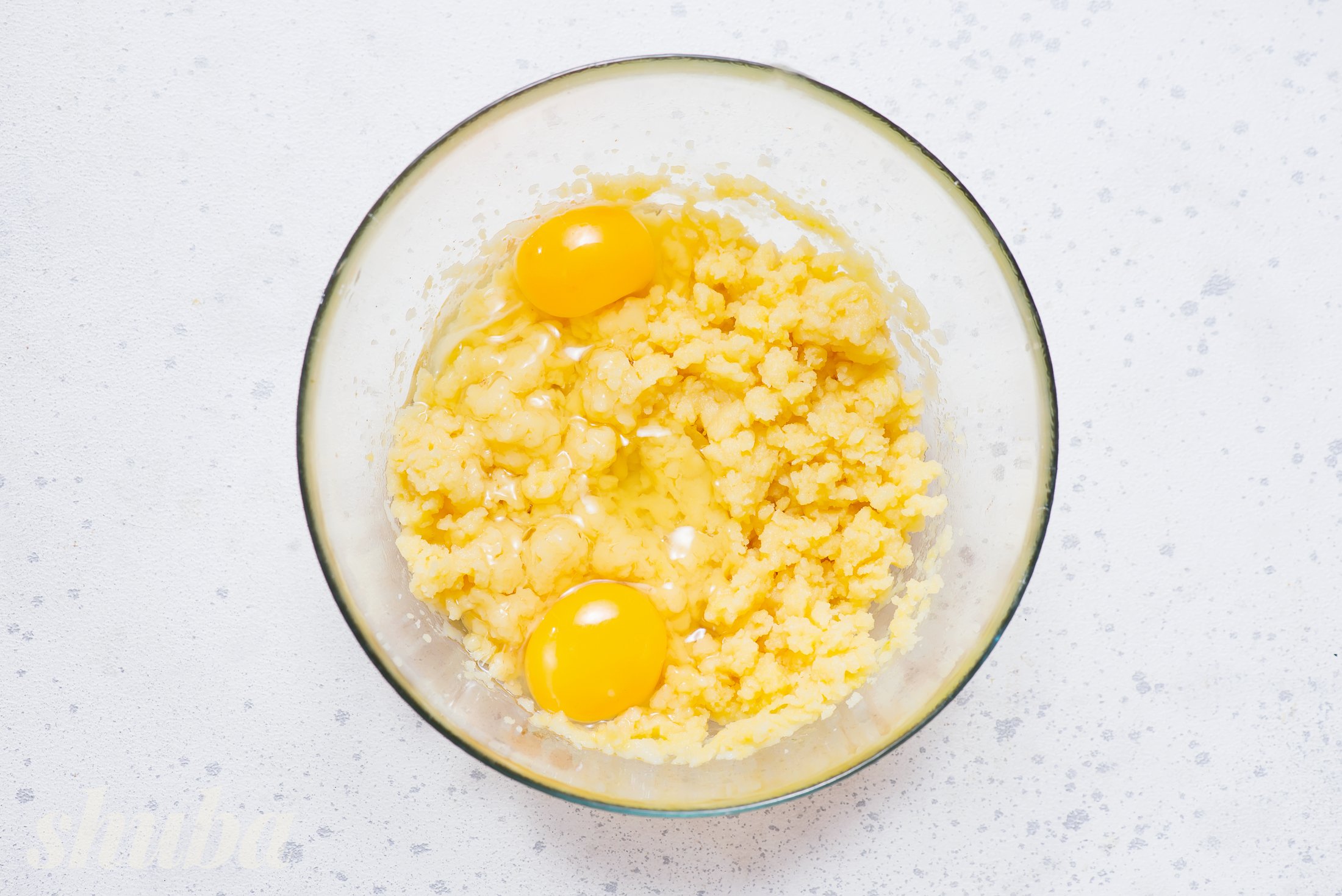 Переклади тісто в миску й дай трохи охолонути. Поступово введи яйця та збивай до гладкої, однорідної консистенції.