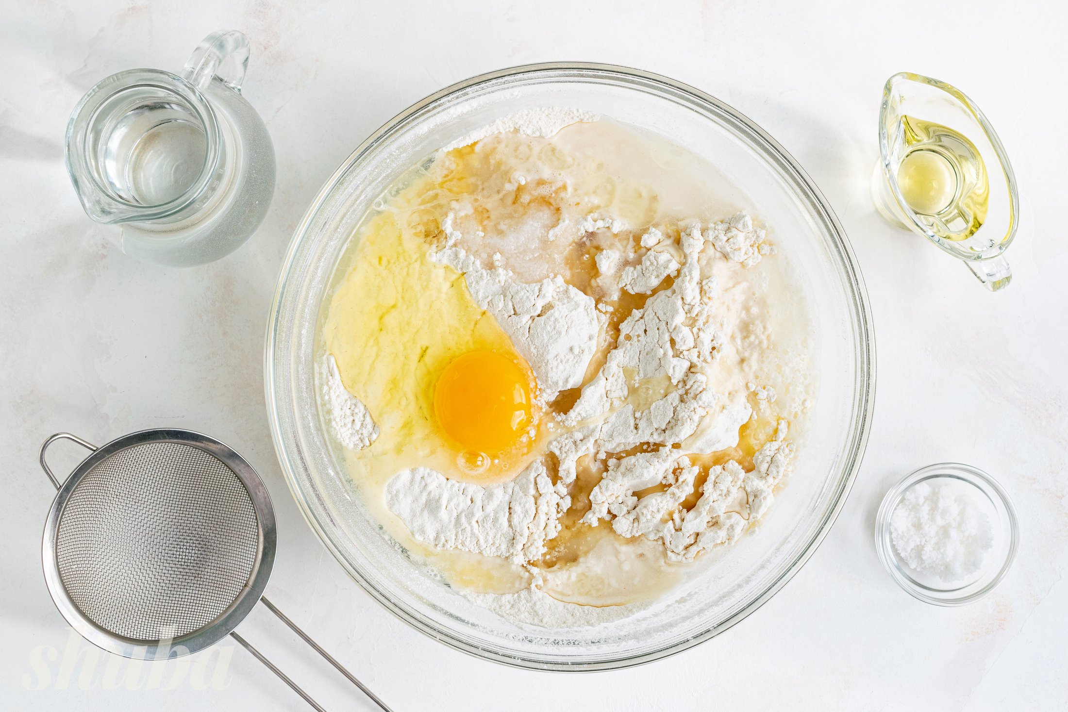 У глибокий посуд просій борошно, додай сіль, вбий яйце, влий теплу воду та олію. Заміси м’яке, еластичне тісто, накрий його рушником і залиш відпочити на 20-30 хвилин.