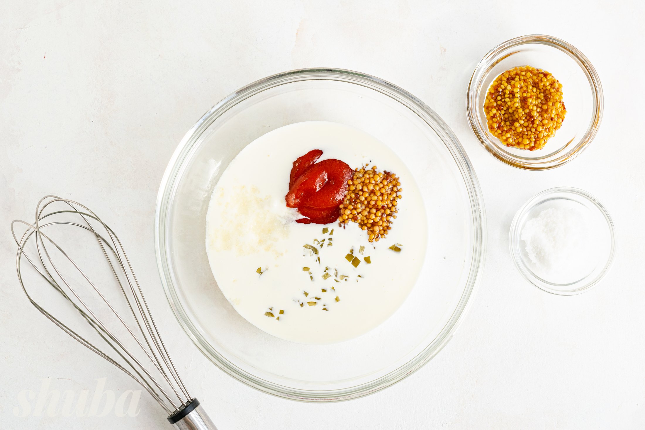Змішай у окремому посуді жирні вершки, кетчуп, французьку гірчицю, подрібнений халапеньйо й сіль до однорідної консистенції.
