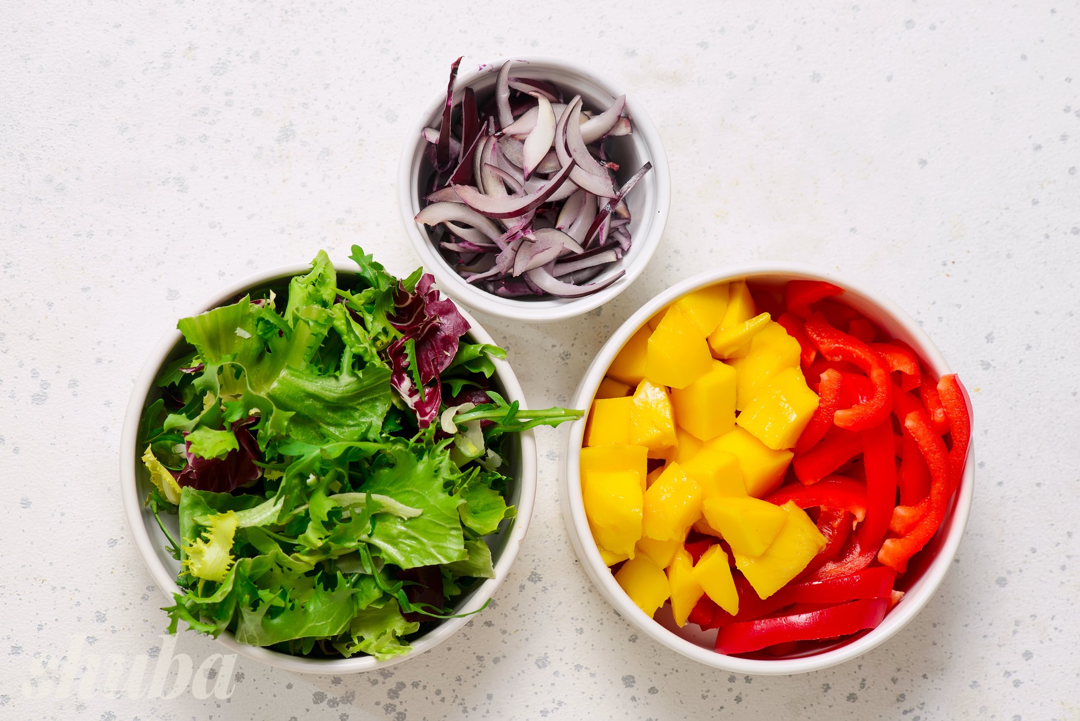 У мисці або на блюді розклади зелень, додай манго, перець і цибулю. Виклади зверху гарячі креветки, полий заправкою й одразу подавай із часточками лайма.