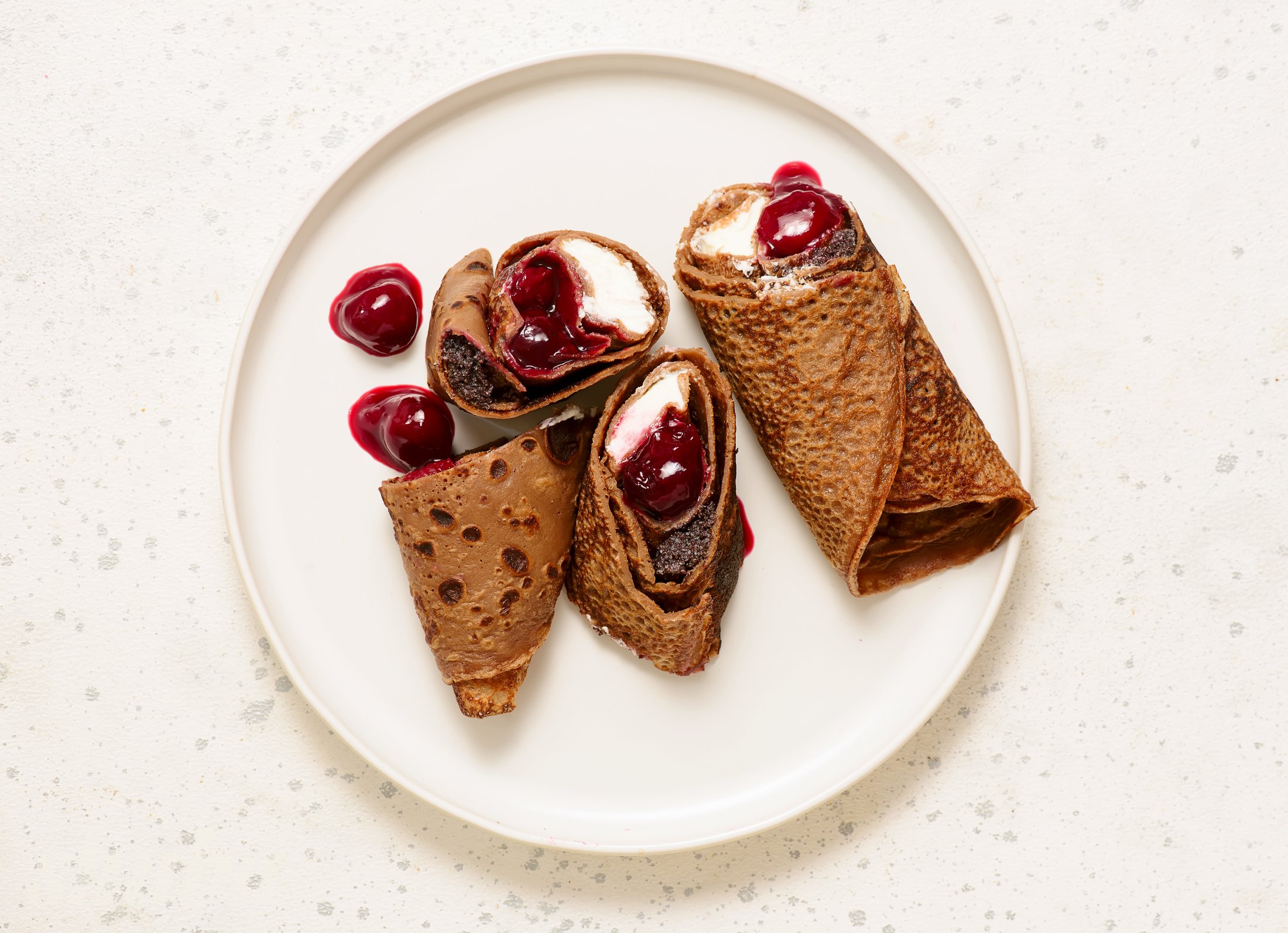 Млинці з трьома начинками — це коли хочеться всього й одразу. Ця страва виглядає як один великий налисник з ніжним сиром, кислуватою вишнею та насиченим маковим смаком. І все це загорнуто в яскраві шоколадні млинці, які готують на молоці з додаванням какао.