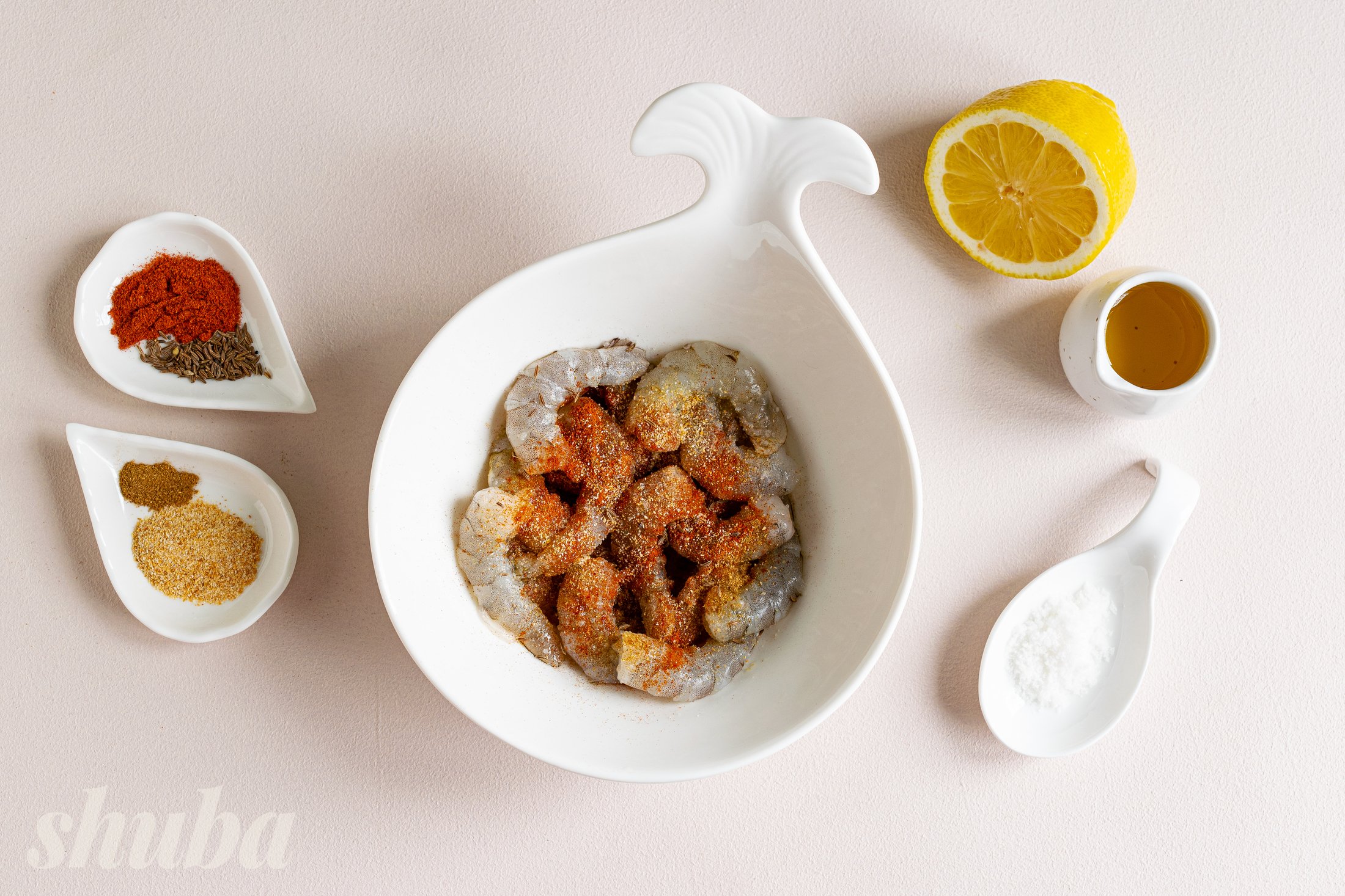 Очисти креветки, помий, переклади в миску, додай оливкову олію та лимонний сік. Посоли за смаком, приправ морепродукти червоним перцем, копченою паприкою, сушеним часником та кмином. Добре перемішай, щоб кожна креветка рівномірно вкрилася маслом та спеціями.